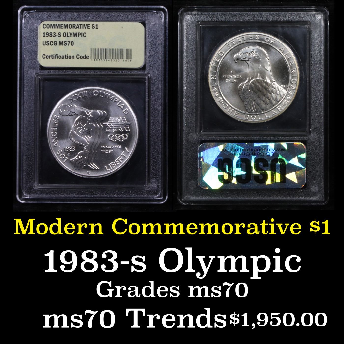 ***Auction Highlight*** 1983-s Olympics Modern Commem Dollar $1 Graded ms70, Perfection By USCG. One of three coins minted in 1983 to mark the 1984 Olympic games. This example is graded Perfection Gem+++ Unc by USCG. Estimated Value $350.