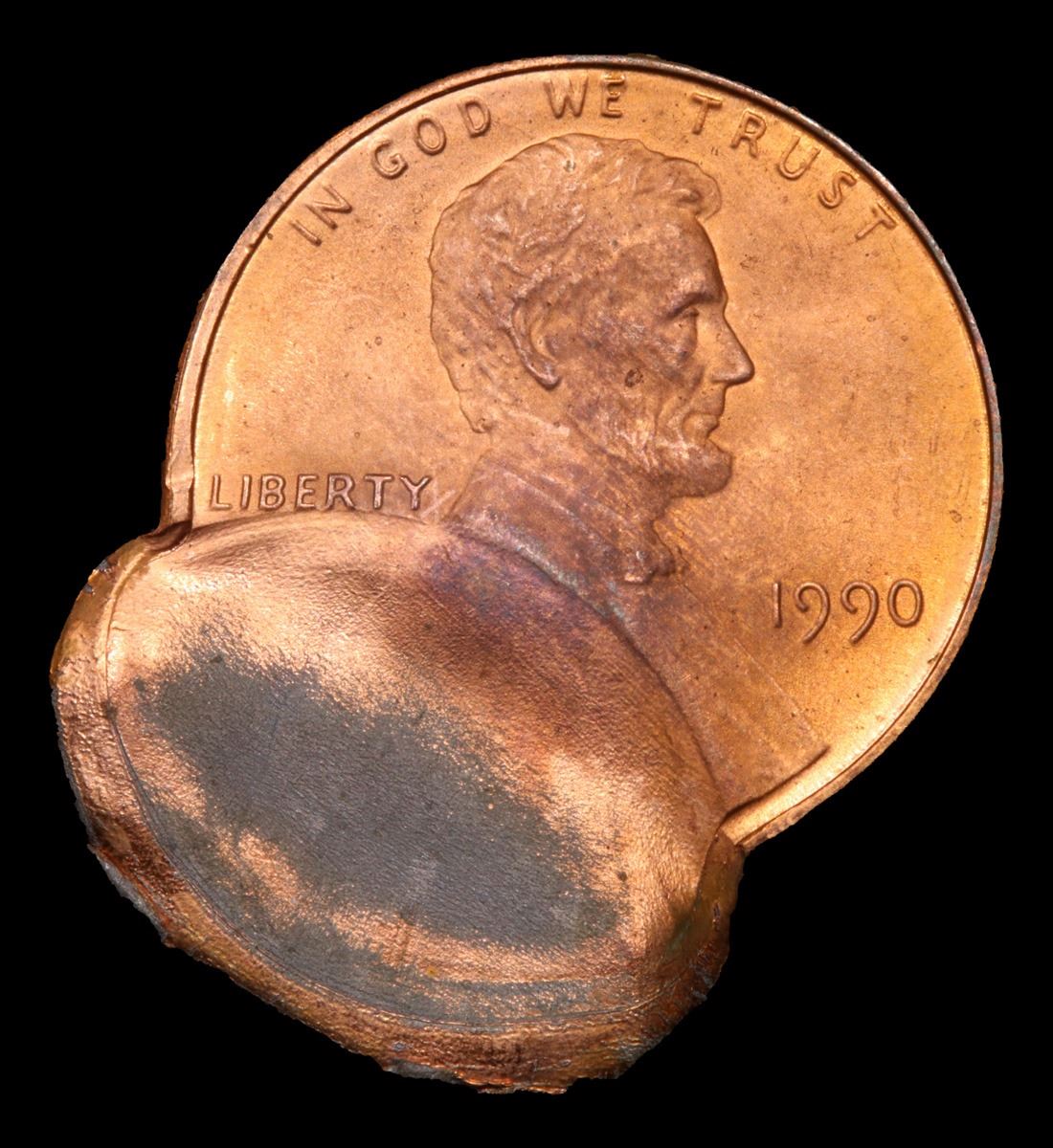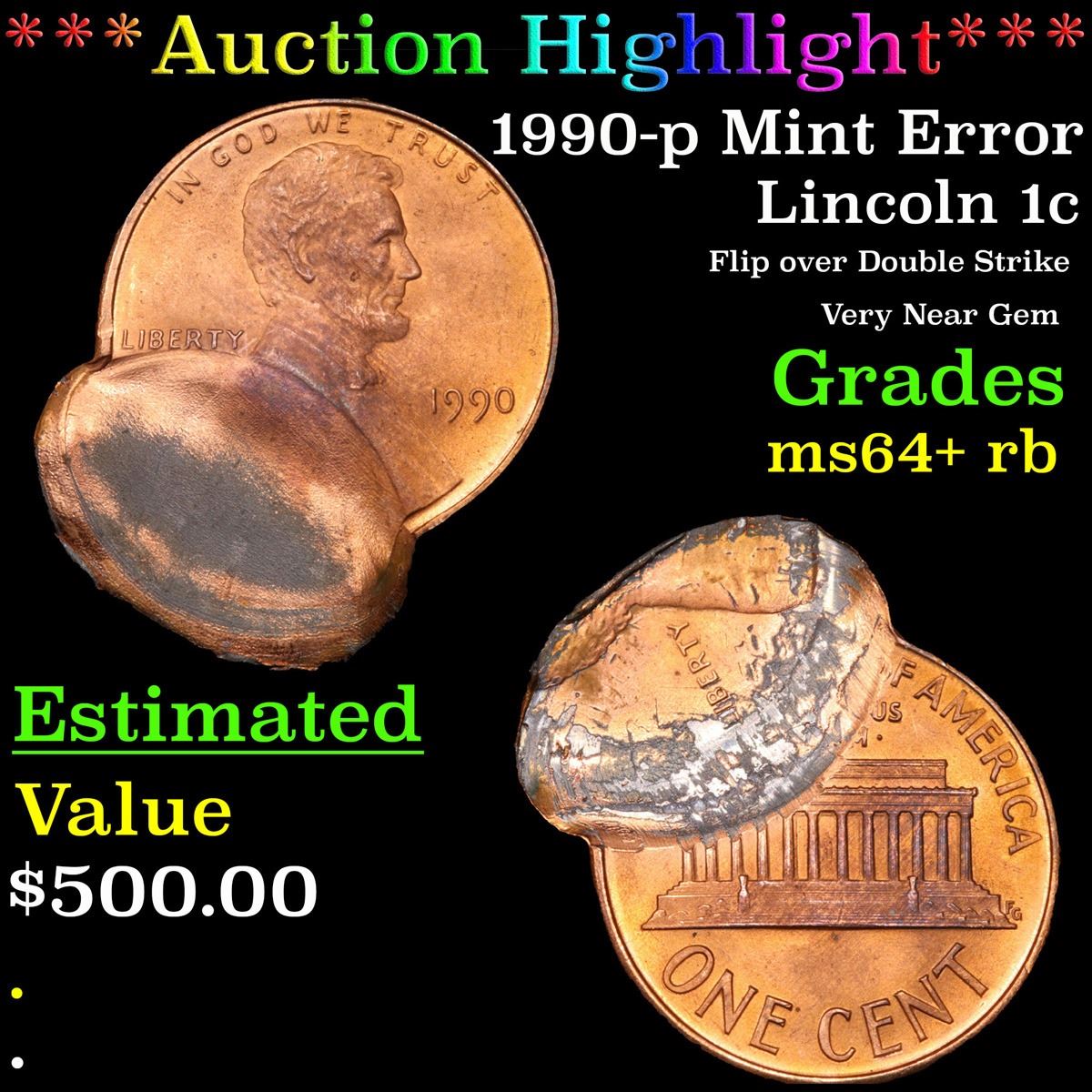 ***Auction Highlight*** 1990-p Mint Error Flip over Double Strike Very Near Gem Lincoln Cent 1c Grades Choice+ Unc RB.