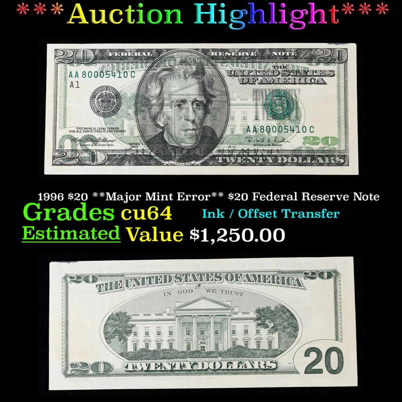 ***Auction Highlight*** 1996 $20 **Major Mint Error** $20 Federal Reserve Note Grades Brilliant Uncirculated. A Key Date's Pick, Bid to Win, Don't let it get Away Coin