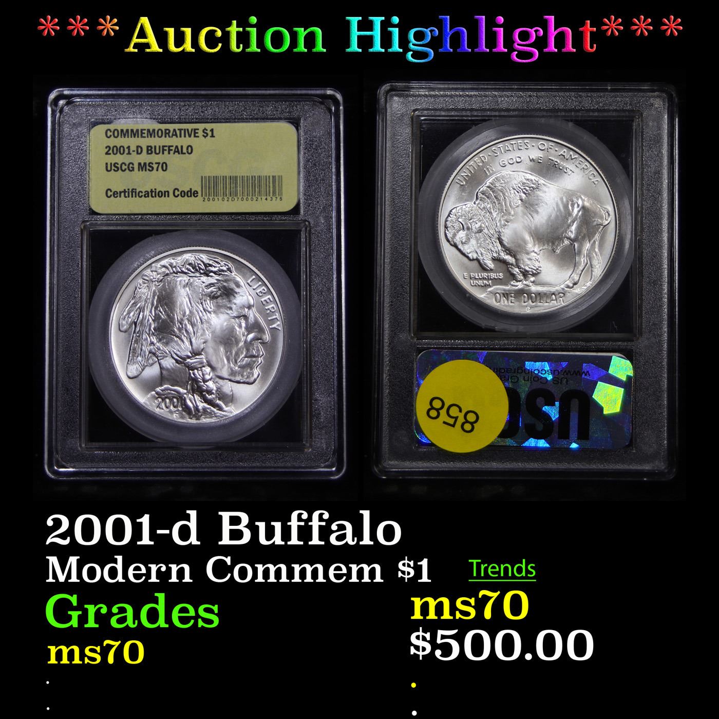 ***Auction Highlight*** 2001-d Buffalo Modern Commem Dollar $1 Graded ms70, Perfection by USCG.