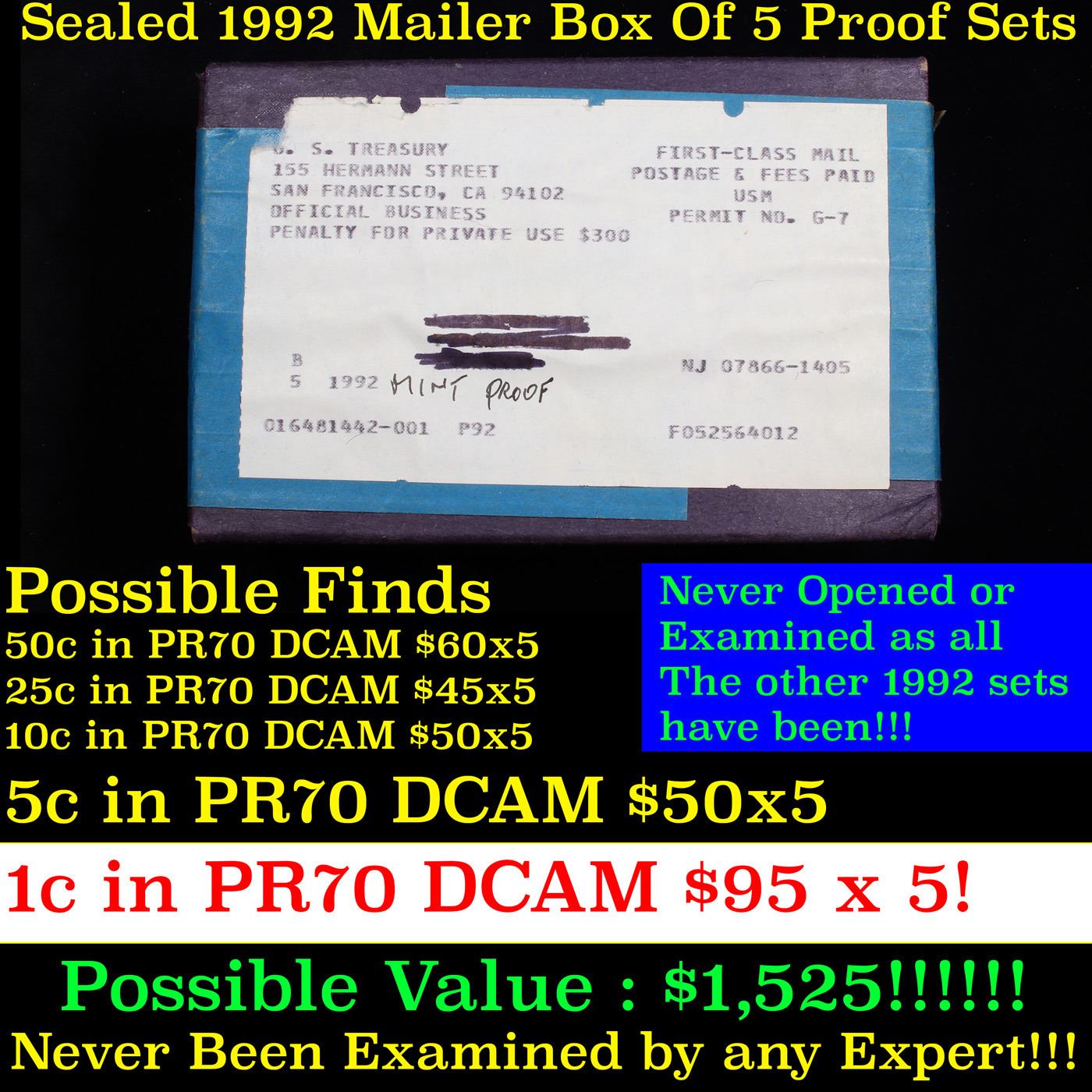 ***Auction Highlight*** 5 Unopened 1992 Mint Proof Sets. Up for Auction is an Unopened Mailer Box from 1994 containing 4 1994 Proof Sets!!!! Wow! - This Mailer Box is sealed exactly as it left the mint over 30 years ago. Each Proof set in this mailer box has never been reviewed or examined by anyone. Virtually every 1994 Proof Set has been looked at by Coin Experts who have identified potential PR70 DCAM Coins and had them slabbed. Those opened Proof Sets you find at coin shows or for sale individually have almost certainly been examined and reviewed. NOT ONE OF THE FIVE SETS IN THIS MAILER BOX HAVE BEEN SEEN BY HUMAN EYES IN 30 YEARS , So, What COULD be in these Sets, Well here are the 5 things that could be inside. A Kennedy 50c in PR70 DCAM Trending $30, a Washington 25c in PR70 DCAM Trending $50, a Roosevelt Dime in PR70 DCAM Trending $45, BUT That’s Just the Start, There also could be a Jefferson 5c in PR70 DCAM, TRENDING $40, BUT EVEN THAT IS JUST THE SIDESHOW! The REAL WINNER IN THIS LOTTERY BOX IS The Lincoln Penny, a 1994 PROOF Lincoln 1c in PR70 DCAM TRENDS $95!!!! And there can be FIVE of Each in this BOX, This could be one of the very last boxes in EXISTENCE. This “WONKA” Box could Contain Coins Worth $1,000 - Good Luck in Obtaining This Unopened Mailer Box of 4 1994 Proof Sets!!!