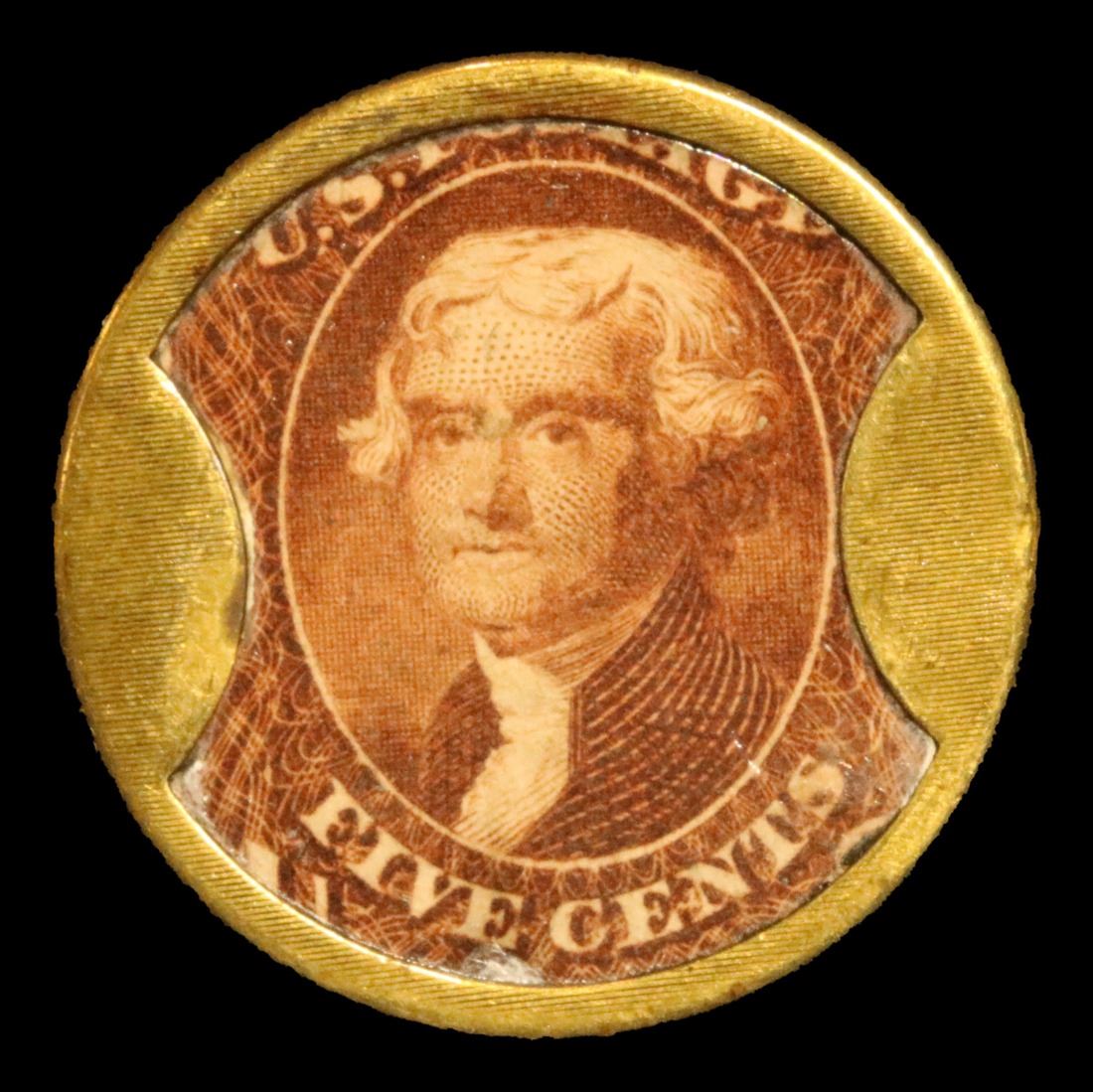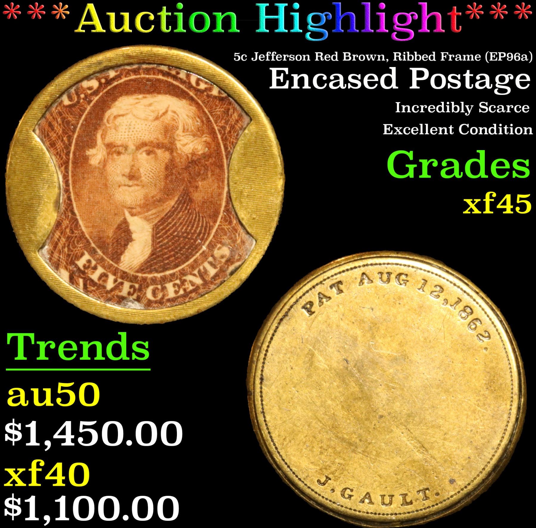 *Auction Highlight* 5c Jefferson Red Brown, Ribbed Frame (EP96a) Encased Postage 5c Grades xf+. Not strictly stamps, coins or paper money. Encased Postage became, for a brief period, a medium with which to buy and trade goods and services. In early July 1862, shortly after the beginning of the Civil War, there was virtually no gold, silver or copper coins available for use of trade or to give change. If one was fortunate or wealthy enough to own ÔÕgreenbacks,Ó there was a premium to buy federal coins. Coins were being hoarded, which made it increasingly difficult to pay for daily needs such as haircuts, milk and the like. At this time some enterprising merchants issued scrip with values up to a dollar advertising their wares, and later tokens also came to the market place. It was during this period that Fractional or Postage Currency notes were developed in the form of small pieces of paper. The latter showed current issues of stamps with their values, thus representing an exchangeable and accepted piece of currency. Originally distributed to Army paymasters, it was not until later, September 1862, that these notes were distributed to the general public. Other actions by the federal government eventually led to the Act of July 17, 1862 which provided for the use of postage stamps as monetary vehicles and thus Encased Postage entered the foray. Due to the fragility of postage stamps, a method of protection had to be developed to prolong their useful life, thus came about the encasing of the stamps. John Gault received a patent; No, 1627 on August 2, 1862. His encasing unit comprised two discs of brass about the size of a quarter, the stamp with itÕs four corners folded down was placed between a mica face, a piece of cardboard against the back side, thus sealing the stamp between the two brass discs. The back casing was left blank in order to allow advertisements by interested parties, for a fee of course. So is it a coin, a stamp or a bank note? We do know that these relics of our past are collected by enthusiasts in all fields and that ÒthereÕs still gold in them there hills!Ó A Corey's Pick, Bid to Win, Don't let it get Away, you might not find its equal Coin. I give this coin my highest recommendation