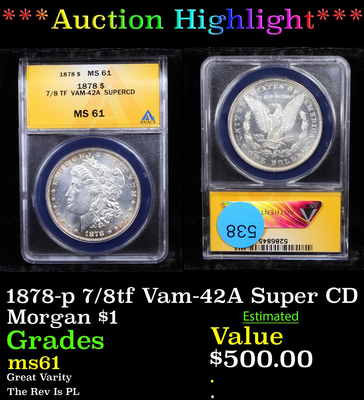 ***Auction Highlight*** ANACS 1878-p 7/8tf Vam-42A Super CD Morgan Dollar $1 Graded ms61 By ANACS.