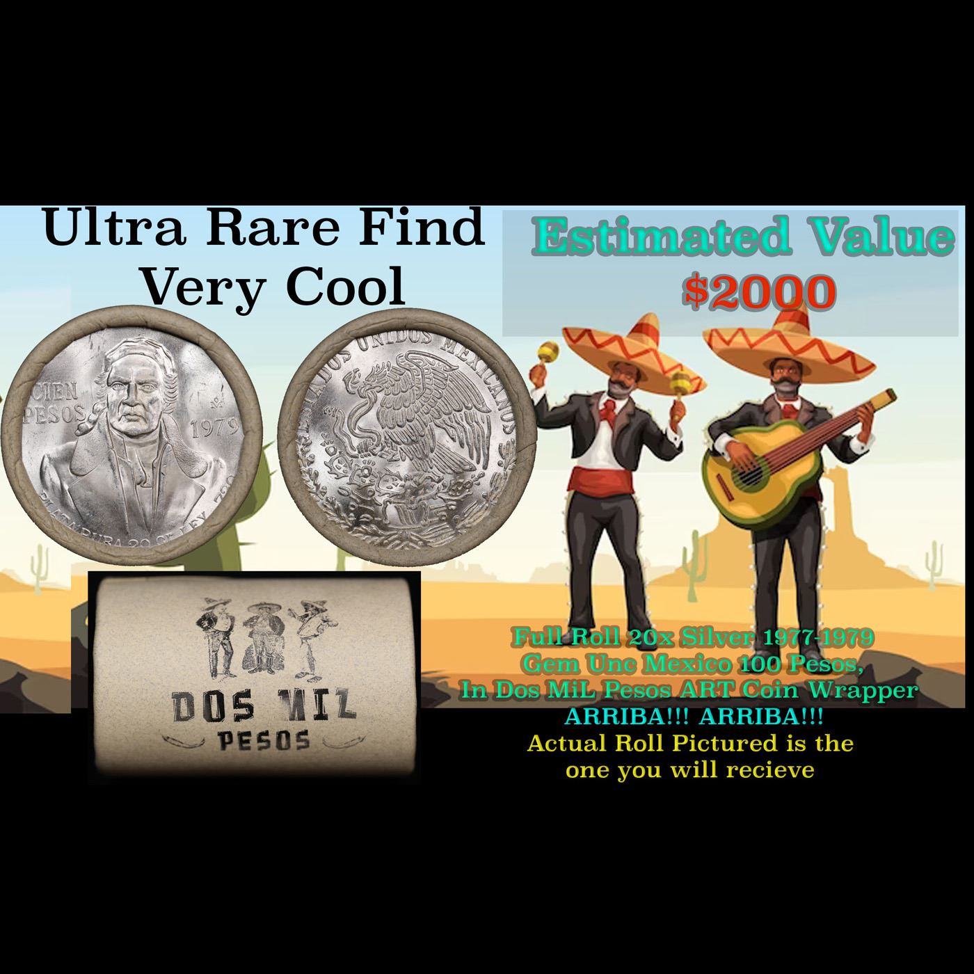 ***Auction Highlight*** ARRIBA! ARRIBA! Ultra Rare Full Roll 20x Silver 1977-1979 Gem Unc Mexico 100 Pesos, In Dos MiL Pesos ART Coin Wrapper KM-483. ARRIBA!!! ARRIBA!!! Ultra Rare Find This roll of 20 Silver Mexican 100 Pesos is held in an old Bank Style Dos MiL (2000 Pesos) Pesos Art Shotgun Roll. Actual roll pictured is the roll you will get. A great Roll of 20 Silver Coins, very tight ends. We have opened a few of these rolls. They seem to be All Gem Unc Or better 1977-1979 Mexico 100 Silver Pesos. Each Coin Weighs 27.77 grams of 0.72 Silver Making Each Coin About 3/4th of an ounce of silver.There are 400.01 Grams or 14.1 Ounces of .999 Silver in this roll. Every Roll Is Stamped "Dos MiL Pesos" And has Three Mariachi Band Members on the side These shotgun rolls are all from a new consignee. They are all from one Estate. Incredible First Time We’ve Been Able to bring this to auction. Very Few Ever Left mexico and the coin was a 3 year type coin. Rarely Comes to action A Key Date's Pick, Bid to Win Coin