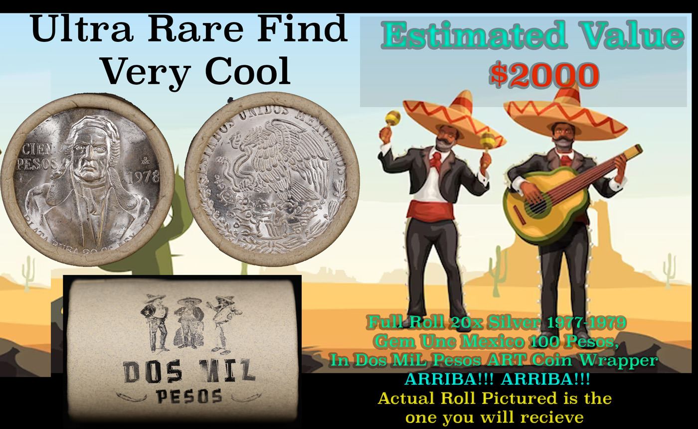 ***Auction Highlight*** ARRIBA! ARRIBA! Ultra Rare Full Roll 20x Silver 1977-1979 Gem Unc Mexico 100 Pesos, In Dos MiL Pesos ART Coin Wrapper KM-483. ARRIBA!!! ARRIBA!!! Ultra Rare Find This roll of 20 Silver Mexican 100 Pesos is held in an old Bank Style Dos MiL (2000 Pesos) Pesos Art Shotgun Roll. Actual roll pictured is the roll you will get. A great Roll of 20 Silver Coins, very tight ends. We have opened a few of these rolls. They seem to be All Gem Unc Or better 1977-1979 Mexico 100 Silver Pesos. Each Coin Weighs 27.77 grams of 0.72 Silver Making Each Coin About 3/4th of an ounce of silver.There are 400.01 Grams or 14.1 Ounces of .999 Silver in this roll. Every Roll Is Stamped "Dos MiL Pesos" And has Three Mariachi Band Members on the side These shotgun rolls are all from a new consignee. They are all from one Estate. Incredible First Time We’ve Been Able to bring this to auction. Very Few Ever Left mexico and the coin was a 3 year type coin. Rarely Comes to action A Key Date's Pick, Bid to Win Coin