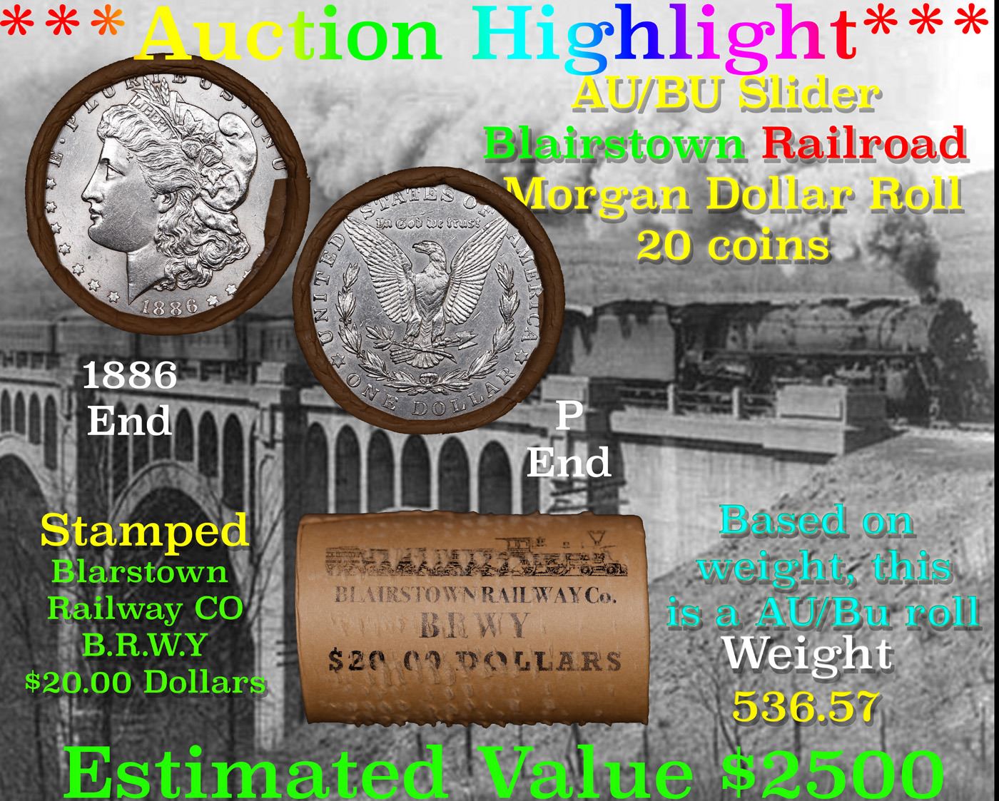 ***Auction Highlight*** AU/BU Slider BRWY Shotgun Morgan $1 Roll 1886 & P Ends Virtually UNC. Up For Auction Is a Very Near Solid Uncirculated Morgan Dollar Roll In an old Blairstown Railway Company Wrapper with Tight Shotgun Ends. This Roll is filled with Virtually all Uncirculated Silver Dollars. This is how we determined that. A Uncirculated Morgan Dollar a Weights 26.73 Grams. So 20 of them would weigh, 534.6 Grams. Our Uncirculated Roll Weighs 536.7 Grams, so the Wrappers weigh 2.1 Grams. The Roll at hand weighs 536.57 Grams. Deducting the Wrapper Weight of 2.1 Grams, the average coin in this roll weights 26.72 Grams. Your going to find in this roll a lot of Uncirculated coins and a few sliders. This is a Very Near Solid roll of Uncirculated Morgan Dollars.