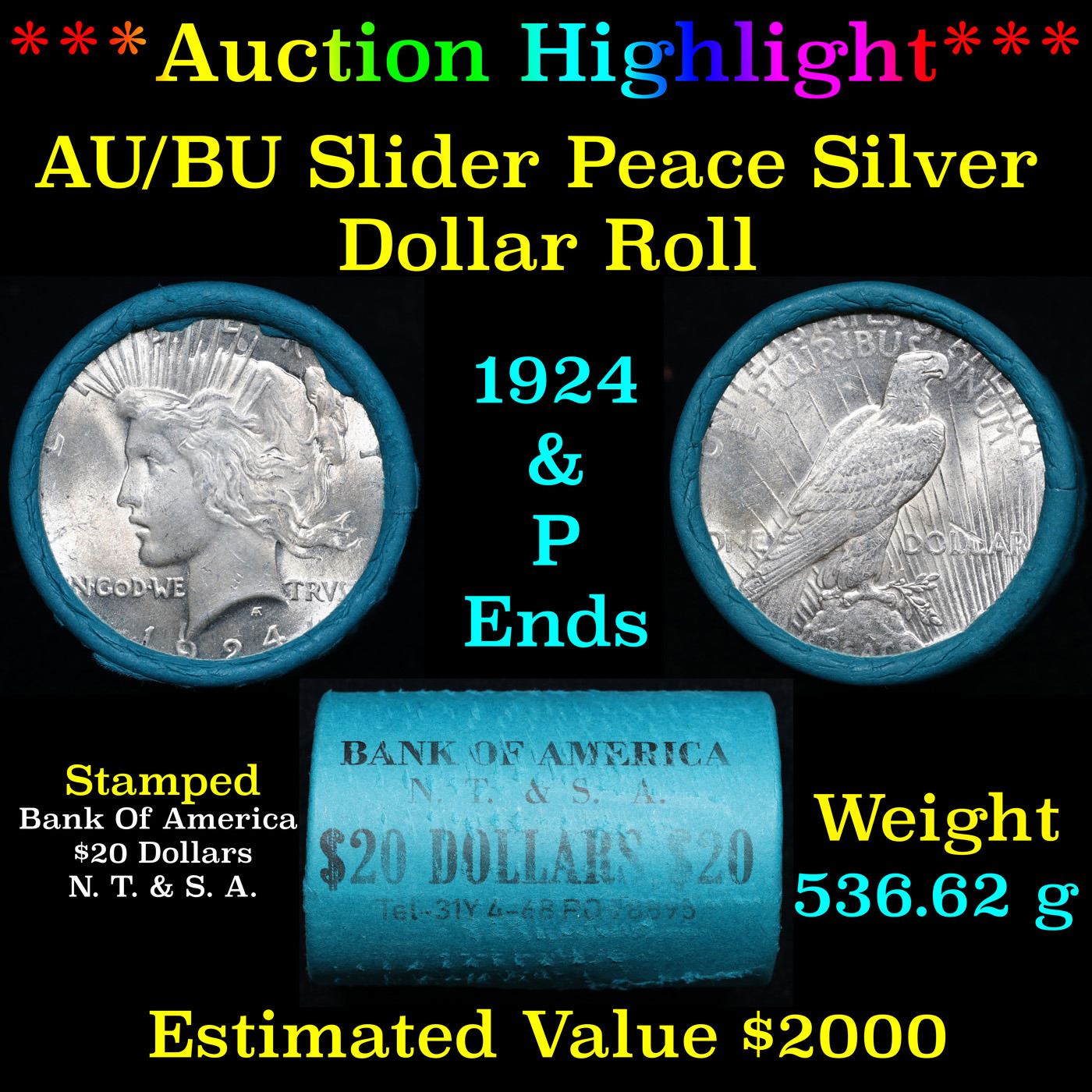 ***Auction Highlight*** AU/BU Slider Bank Of America Peace $1 Roll 1924 & P Ends Virtually UNC (fc)