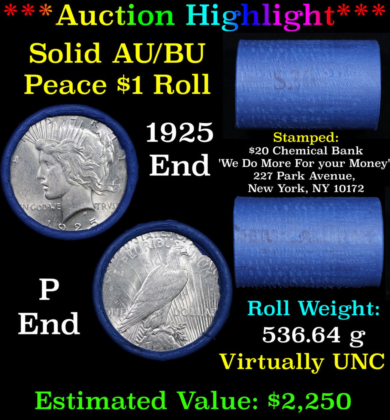 ***Auction Highlight*** AU/BU Slider Bank Of America Peace $1 Roll 1925 & P Ends Virtually UNC (fc)