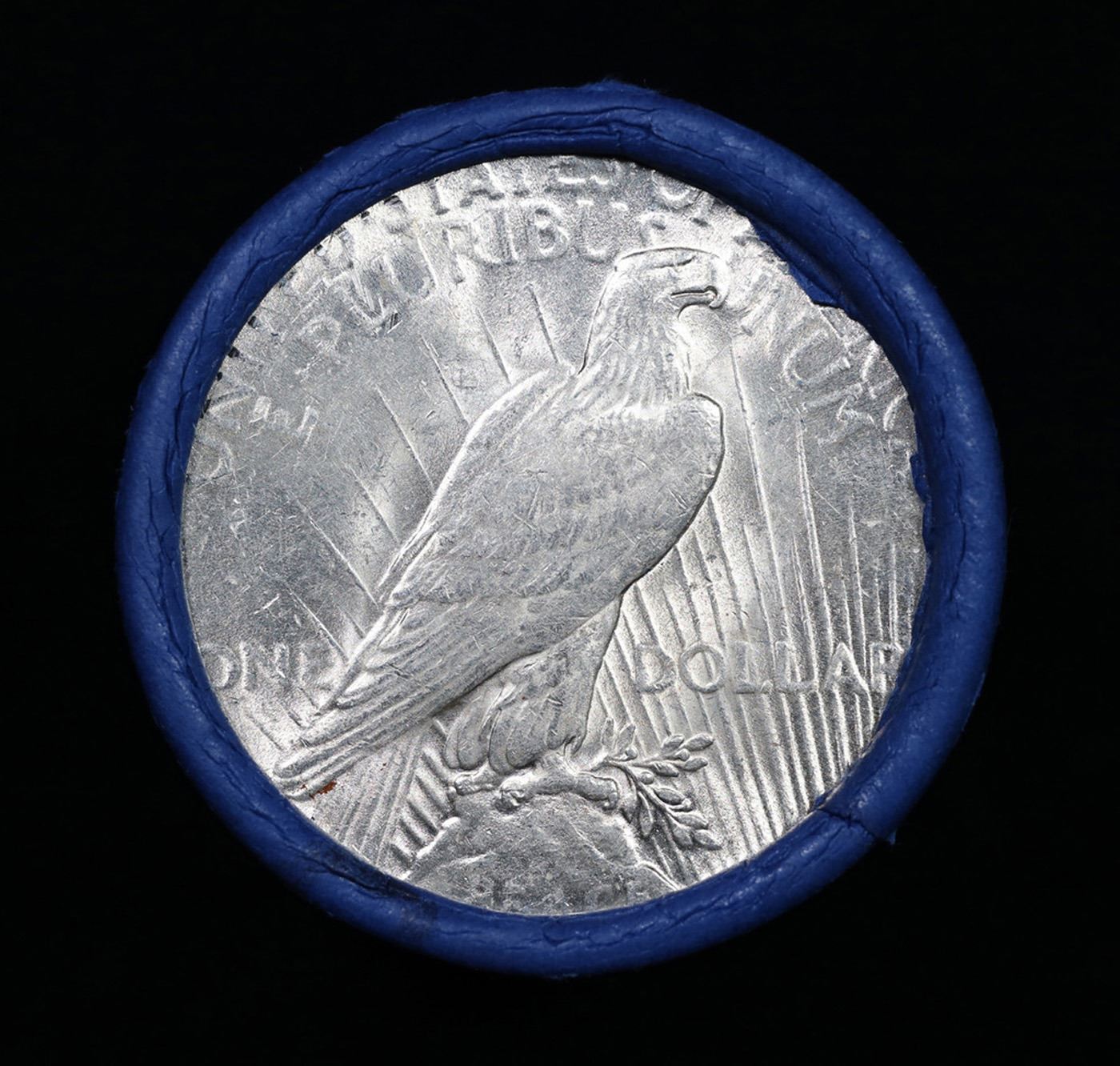 ***Auction Highlight*** AU/BU Slider Bank Of America Peace $1 Roll 1925 & P Ends Virtually UNC. Up For Auction Is a Very Near Solid Uncirculated Peace Dollar Roll In an old 'Bank Of America T S $20 Dollars' with Tight Shotgun Ends. This Roll is filled with Virtually all Uncirculated Silver Dollars. This is how we determined that. A Uncirculated Peace Dollar a Weights 26.73 Grams. So 20 of them would weigh, 534.6 Grams. Our Uncirculated Roll Weighs 536.7 Grams, so the Wrappers weigh 2.1 Grams. The Roll at hand weighs 536.64 Grams. Deducting the Wrapper Weight of 2.1 Grams, the average coin in this roll weights 26.72 Grams. Your going to find in this roll a lot of Uncirculated coins and a few sliders. This is a Very Near Solid roll of Uncirculated Peace Dollars.