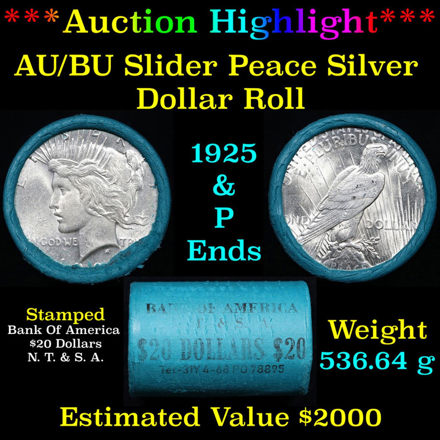 ***Auction Highlight*** AU/BU Slider Bank Of America Peace $1 Roll 1925 & P Ends Virtually UNC (fc)