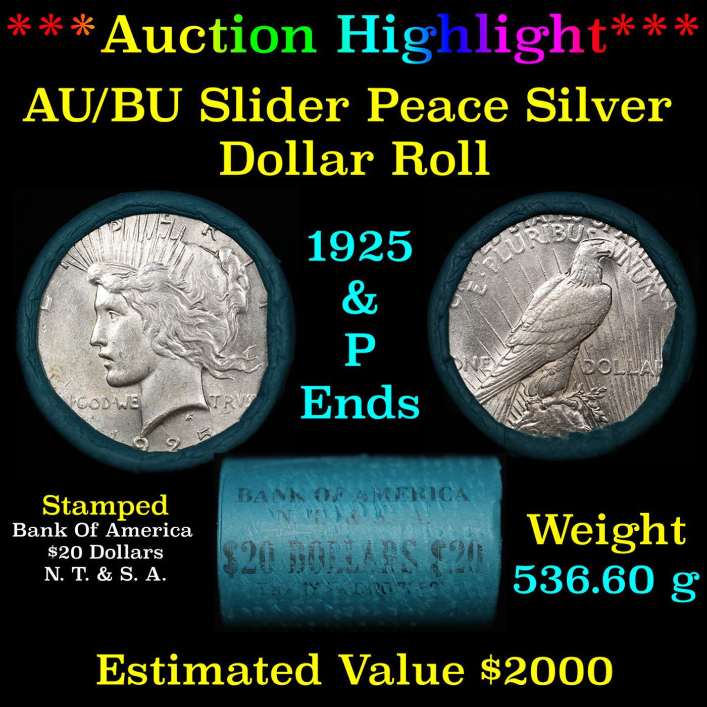 ***Auction Highlight*** AU/BU Slider Bank Of America Peace $1 Roll 1925 & P Ends Virtually UNC (fc)