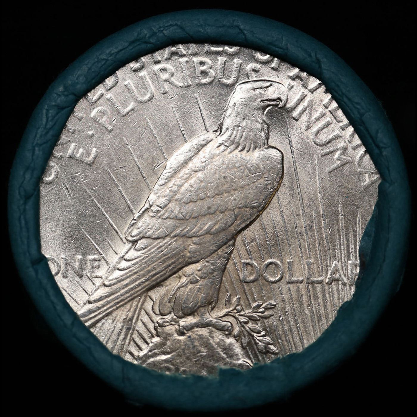 ***Auction Highlight*** AU/BU Slider Bank Of America Peace $1 Roll 1925 & P Ends Virtually UNC. Up For Auction Is a Very Near Solid Uncirculated Peace Dollar Roll In an old 'Bank Of America T & S $20 Dollars' with Tight Shotgun Ends. This Roll is filled with Virtually all Uncirculated Silver Dollars. This is how we determined that. A Uncirculated Peace Dollar a Weights 26.73 Grams. So 20 of them would weigh, 534.6 Grams. Our Uncirculated Roll Weighs 536.7 Grams, so the Wrappers weigh 2.1 Grams. The Roll at hand weighs 536.60 Grams. Deducting the Wrapper Weight of 2.1 Grams, the average coin in this roll weights 26.72 Grams. Your going to find in this roll a lot of Uncirculated coins and a few sliders. This is a Very Near Solid roll of Uncirculated Peace Dollars.