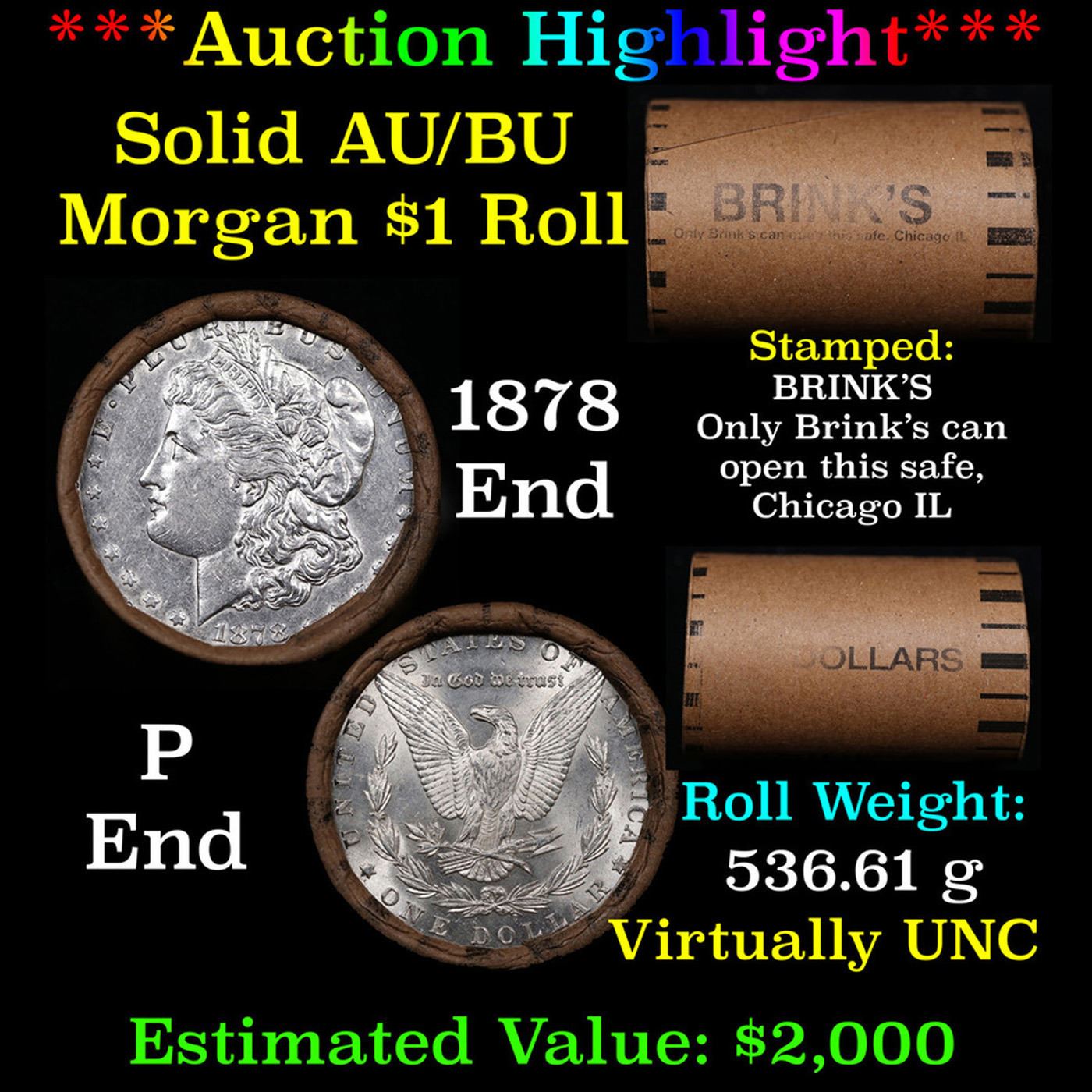 ***Auction Highlight*** AU/BU Slider Brinks Shotgun Morgan $1 Roll 1878 & P Ends Virtually UNC. Up For Auction Is a Very Near Solid Uncirculated Morgan Dollar Roll In an old Brinks Wrapper with Tight Shotgun Ends. This Roll is filled with Virtually all Uncirculated Silver Dollars. This is how we determined that. A Uncirculated Morgan Dollar a Weights 26.73 Grams. So 20 of them would weigh, 534.6 Grams. Our Uncirculated Roll Weighs 536.7 Grams, so the Wrappers weigh 2.1 Grams. The Roll at hand weighs 536.61 Grams. Deducting the Wrapper Weight of 2.1 Grams, the average coin in this roll weights 26.72 Grams. Your going to find in this roll a lot of Uncirculated coins and a few sliders. This is a Very Near Solid roll of Uncirculated Morgan Dollars.