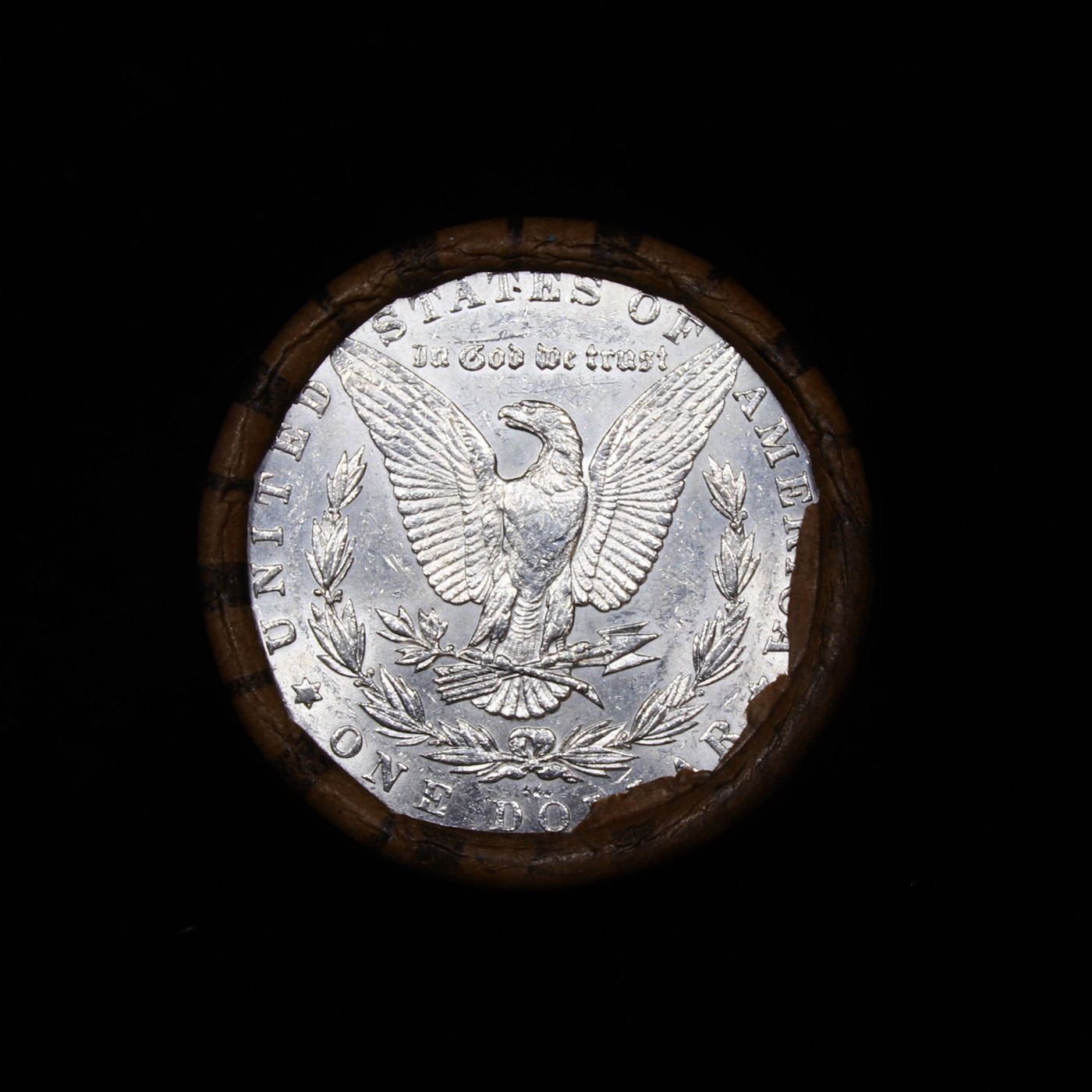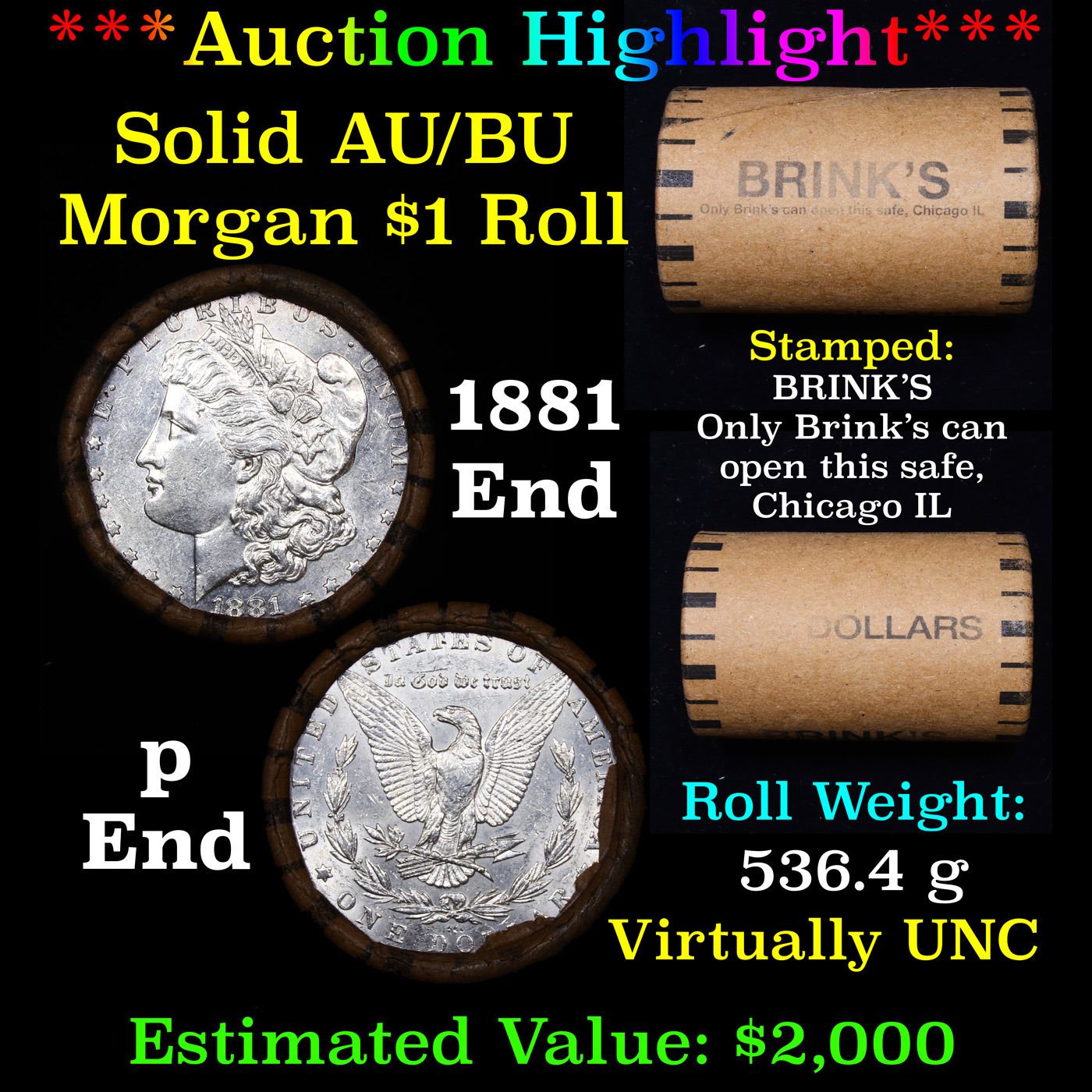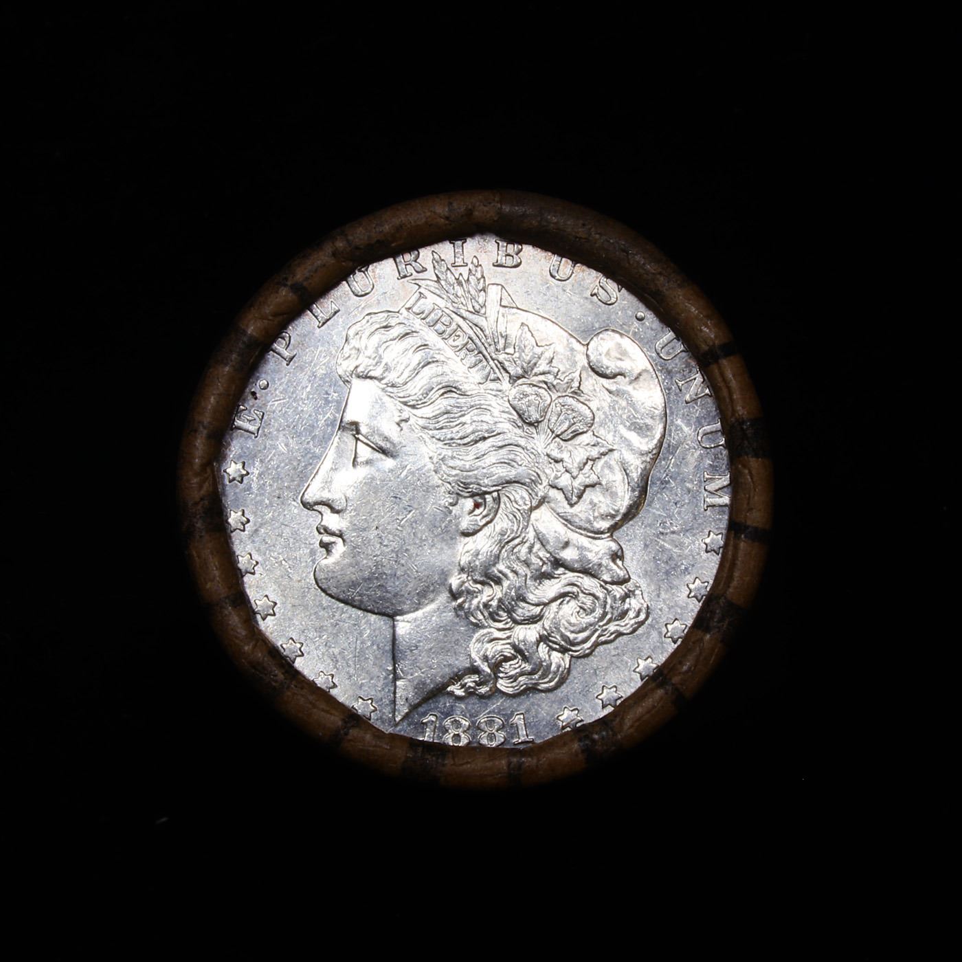 ***Auction Highlight*** AU/BU Slider Brinks Shotgun Morgan $1 Roll 1881 & P Ends Virtually UNC. . Up For Auction Is a Very Near Solid Uncirculated Morgan Dollar Roll In an old Brinks Wrapper with Tight Shotgun Ends. This Roll is filled with Virtually all Uncirculated Silver Dollars. This is how we determined that. An Uncirculated Morgan Dollar Weighs 26.73 Grams. So 20 of them would weigh, 534.6 Grams. Our Uncirculated Roll Weighs 536.7 Grams, so the Wrappers weigh 2.1 Grams. The Roll at hand weighs 536.4 Grams. Deducting the Wrapper Weight of 2.1 Grams, the average coin in this roll weights 26.71 Grams. Your going to find in this roll a lot of Uncirculated coins and a few sliders. This is a Very Near Solid roll of Uncirculated Morgan Dollars.