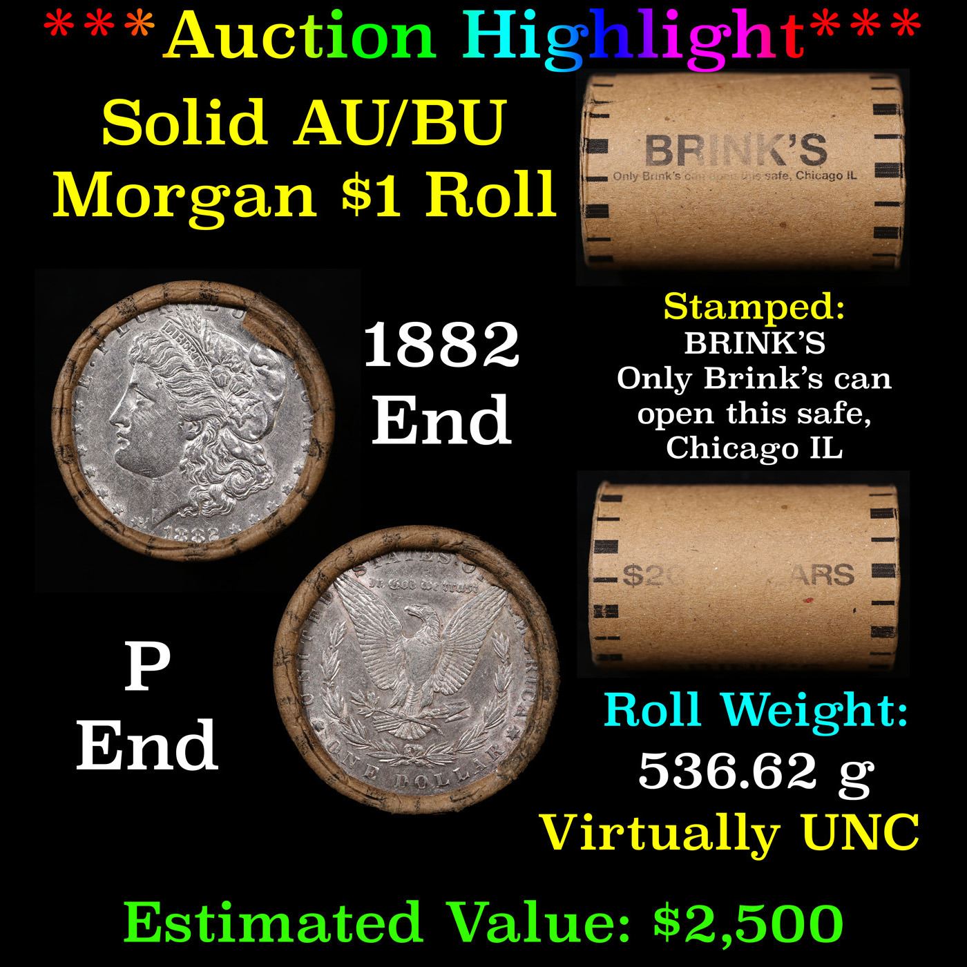 ***Auction Highlight*** AU/BU Slider Brinks Shotgun Morgan $1 Roll 1882 & 'P' Ends Virtually UNC (f