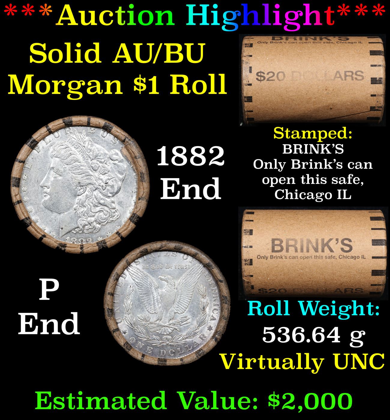 ***Auction Highlight*** AU/BU Slider Brinks Shotgun Morgan $1 Roll 1882 & P Ends Virtually UNC. Up For Auction Is a Very Near Solid Uncirculated Morgan Dollar Roll In an old Brinks Wrapper with Tight Shotgun Ends. This Roll is filled with Virtually all Uncirculated Silver Dollars. This is how we determined that. A Uncirculated Morgan Dollar a Weights 26.73 Grams. So 20 of them would weigh, 534.6 Grams. Our Uncirculated Roll Weighs 536.7 Grams, so the Wrappers weigh 2.1 Grams. The Roll at hand weighs 536.64 Grams. Deducting the Wrapper Weight of 2.1 Grams, the average coin in this roll weights 26.72 Grams. Your going to find in this roll a lot of Uncirculated coins and a few sliders. This is a Very Near Solid roll of Uncirculated Morgan Dollars.