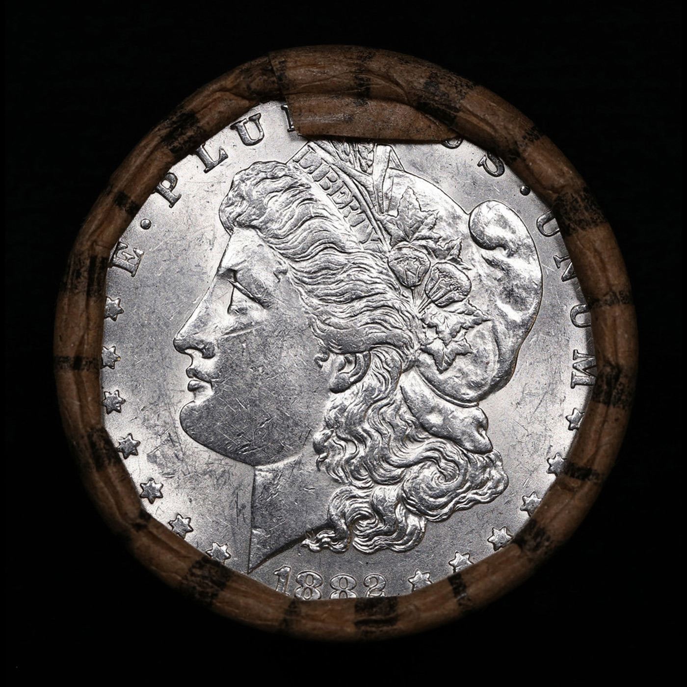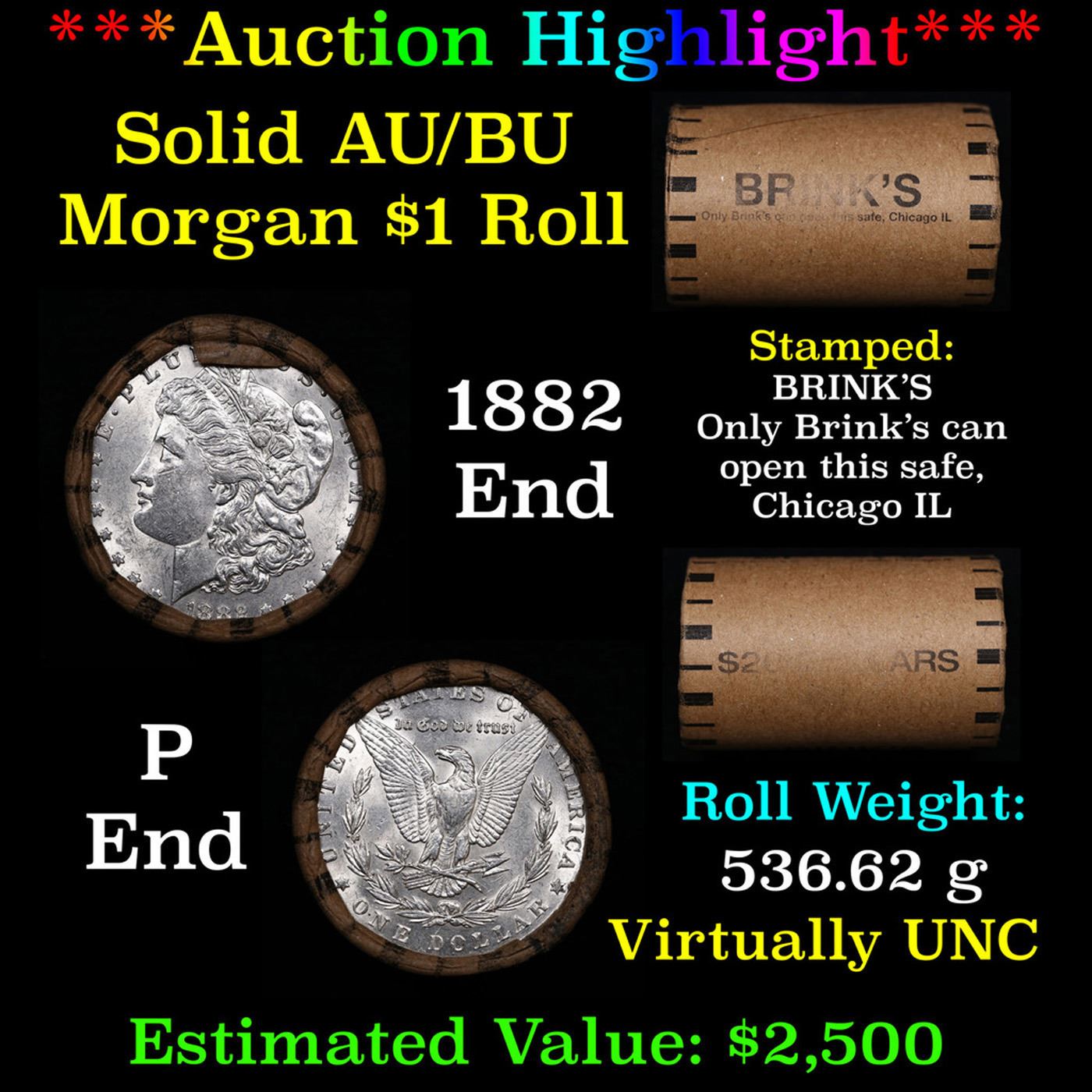 ***Auction Highlight*** AU/BU Slider Brinks Shotgun Morgan $1 Roll 1882 & P Ends Virtually UNC. Up For Auction Is a Very Near Solid Uncirculated Morgan Dollar Roll In an old Brinks Wrapper with Tight Shotgun Ends. This Roll is filled with Virtually all Uncirculated Silver Dollars. This is how we determined that. A Uncirculated Morgan Dollar a Weights 26.73 Grams. So 20 of them would weigh, 534.6 Grams. Our Uncirculated Roll Weighs 536.7 Grams, so the Wrappers weigh 2.1 Grams. The Roll at hand weighs 536.62 Grams. Deducting the Wrapper Weight of 2.1 Grams, the average coin in this roll weights 26.72 Grams. Your going to find in this roll a lot of Uncirculated coins and a few sliders. This is a Very Near Solid roll of Uncirculated Morgan Dollars.