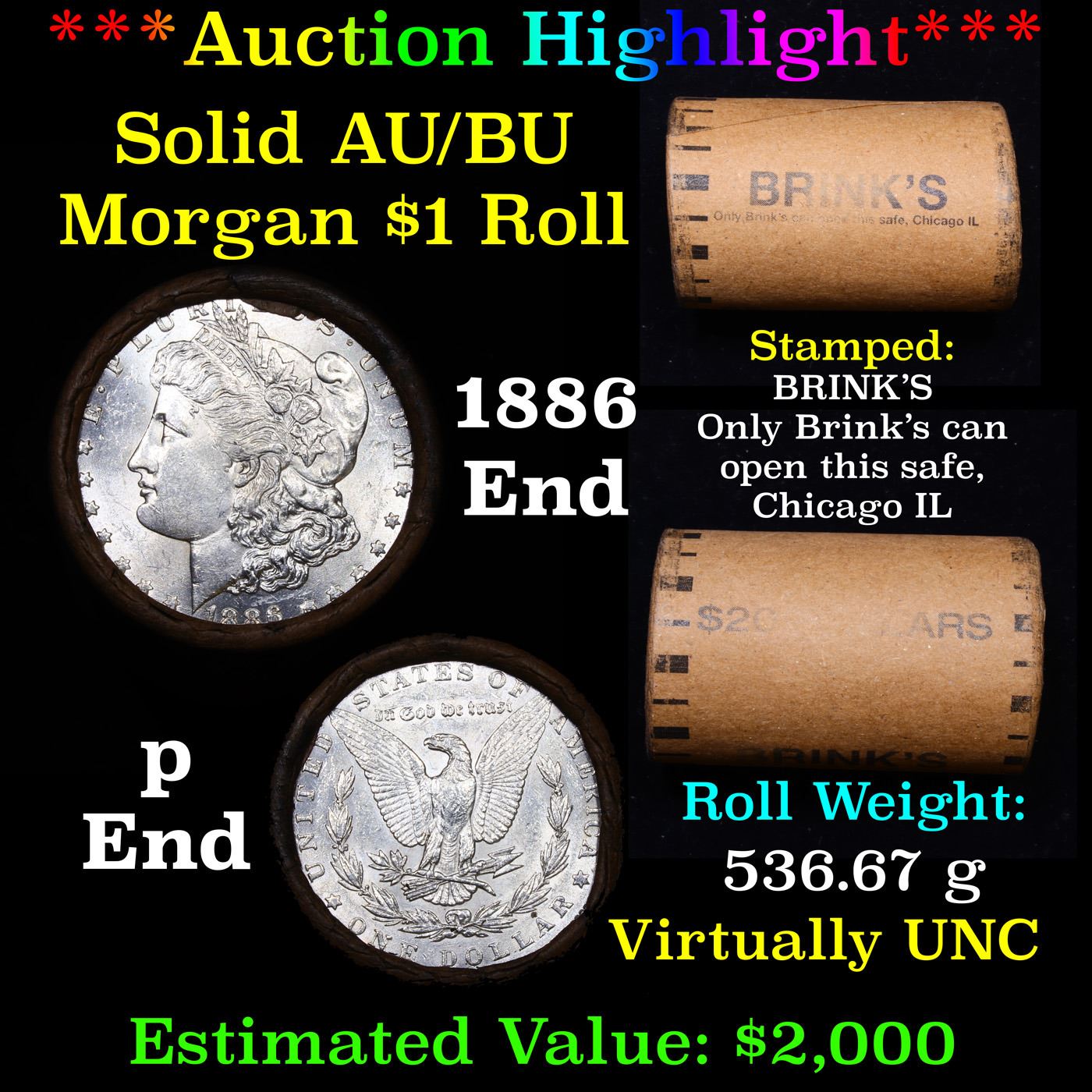 ***Auction Highlight*** AU/BU Slider Brinks Shotgun Morgan $1 Roll 1886 & P Ends Virtually UNC. Up For Auction Is a Very Near Solid Uncirculated Morgan Dollar Roll In an old Brinks Wrapper with Tight Shotgun Ends. This Roll is filled with Virtually all Uncirculated Silver Dollars. This is how we determined that. A Uncirculated Morgan Dollar a Weights 26.73 Grams. So 20 of them would weigh, 534.6 Grams. Our Uncirculated Roll Weighs 536.7 Grams, so the Wrappers weigh 2.1 Grams. The Roll at hand weighs 536.67 Grams. Deducting the Wrapper Weight of 2.1 Grams, the average coin in this roll weights 26.83 Grams. Your going to find in this roll a lot of Uncirculated coins and a few sliders. This is a Very Near Solid roll of Uncirculated Morgan Dollars.