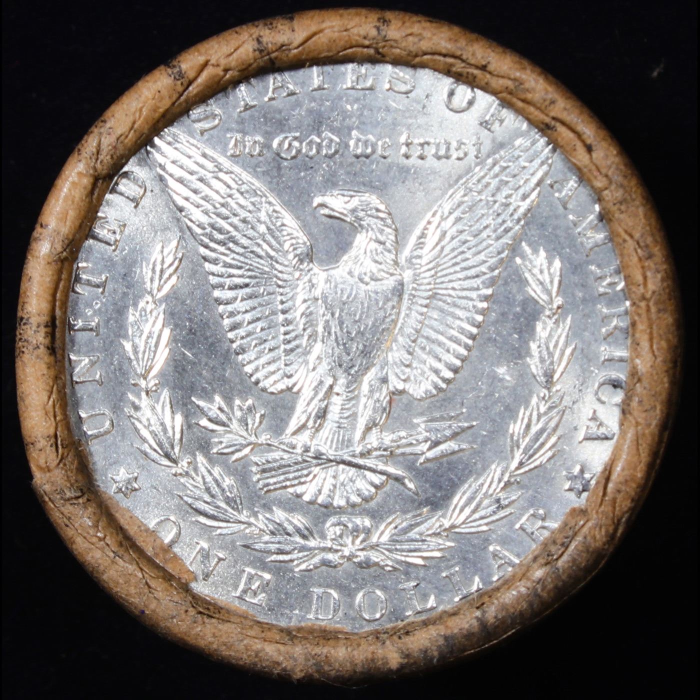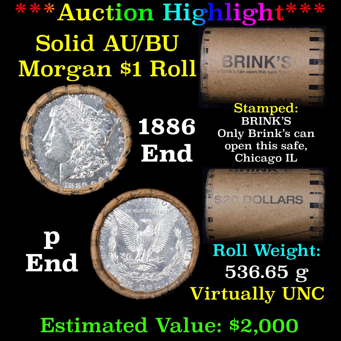 ***Auction Highlight*** AU/BU Slider Brinks Shotgun Morgan $1 Roll 1886 & P Ends Virtually UNC. Up For Auction Is a Very Near Solid Uncirculated Morgan Dollar Roll In an old Brinks Wrapper with Tight Shotgun Ends. This Roll is filled with Virtually all Uncirculated Silver Dollars. This is how we determined that. A Uncirculated Morgan Dollar a Weights 26.73 Grams. So 20 of them would weigh, 534.6 Grams. Our Uncirculated Roll Weighs 536.7 Grams, so the Wrappers weigh 2.1 Grams. The Roll at hand weighs 536.63 Grams. Deducting the Wrapper Weight of 2.1 Grams, the average coin in this roll weights 26.72 Grams. Your going to find in this roll a lot of Uncirculated coins and a few sliders. This is a Very Near Solid roll of Uncirculated Morgan Dollars.