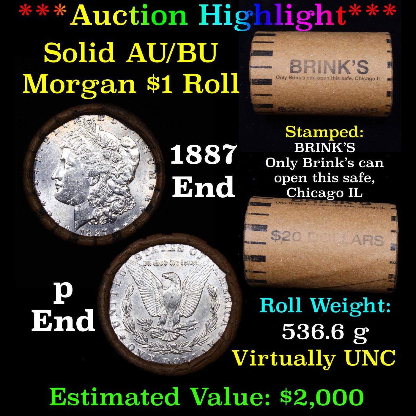 ***Auction Highlight*** AU/BU Slider Brinks Shotgun Morgan $1 Roll 1887 & P Ends Virtually UNC. . Up For Auction Is a Very Near Solid Uncirculated Morgan Dollar Roll In an old Brinks Wrapper with Tight Shotgun Ends. This Roll is filled with Virtually all Uncirculated Silver Dollars. This is how we determined that. An Uncirculated Morgan Dollar Weighs 26.73 Grams. So 20 of them would weigh, 534.6 Grams. Our Uncirculated Roll Weighs 536.7 Grams, so the Wrappers weigh 2.1 Grams. The Roll at hand weighs 536.6 Grams. Deducting the Wrapper Weight of 2.1 Grams, the average coin in this roll weights 26.72 Grams. Your going to find in this roll a lot of Uncirculated coins and a few sliders. This is a Very Near Solid roll of Uncirculated Morgan Dollars.