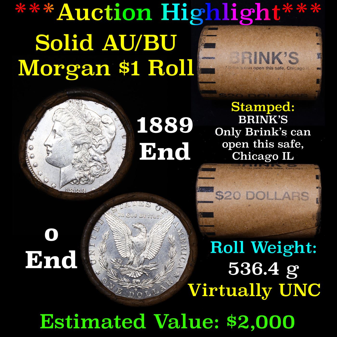 ***Auction Highlight*** AU/BU Slider Brinks Shotgun Morgan $1 Roll 1889 & O Ends Virtually UNC. Up For Auction Is a Very Near Solid Uncirculated Morgan Dollar Roll In an old Brinks Wrapper with Tight Shotgun Ends. This Roll is filled with Virtually all Uncirculated Silver Dollars. This is how we determined that. A Uncirculated Morgan Dollar a Weights 26.73 Grams. So 20 of them would weigh, 534.6 Grams. Our Uncirculated Roll Weighs 536.7 Grams, so the Wrappers weigh 2.1 Grams. The Roll at hand weighs 536.40 Grams. Deducting the Wrapper Weight of 2.1 Grams, the average coin in this roll weights 26.71 Grams. Your going to find in this roll a lot of Uncirculated coins and a few sliders. This is a Very Near Solid roll of Uncirculated Morgan Dollars.