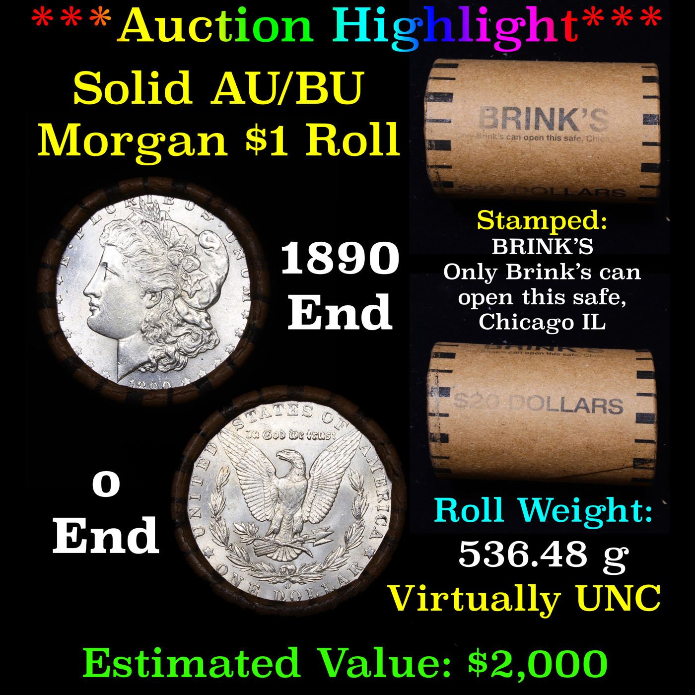 ***Auction Highlight*** AU/BU Slider Brinks Shotgun Morgan $1 Roll 1898 & P Ends Virtually UNC. . Up For Auction Is a Very Near Solid Uncirculated Morgan Dollar Roll In an old Brinks Wrapper with Tight Shotgun Ends. This Roll is filled with Virtually all Uncirculated Silver Dollars. This is how we determined that. An Uncirculated Morgan Dollar Weighs 26.73 Grams. So 20 of them would weigh, 534.6 Grams. Our Uncirculated Roll Weighs 536.7 Grams, so the Wrappers weigh 2.1 Grams. The Roll at hand weighs 536.48 Grams. Deducting the Wrapper Weight of 2.1 Grams, the average coin in this roll weights 26.72 Grams. Your going to find in this roll a lot of Uncirculated coins and a few sliders. This is a Very Near Solid roll of Uncirculated Morgan Dollars.