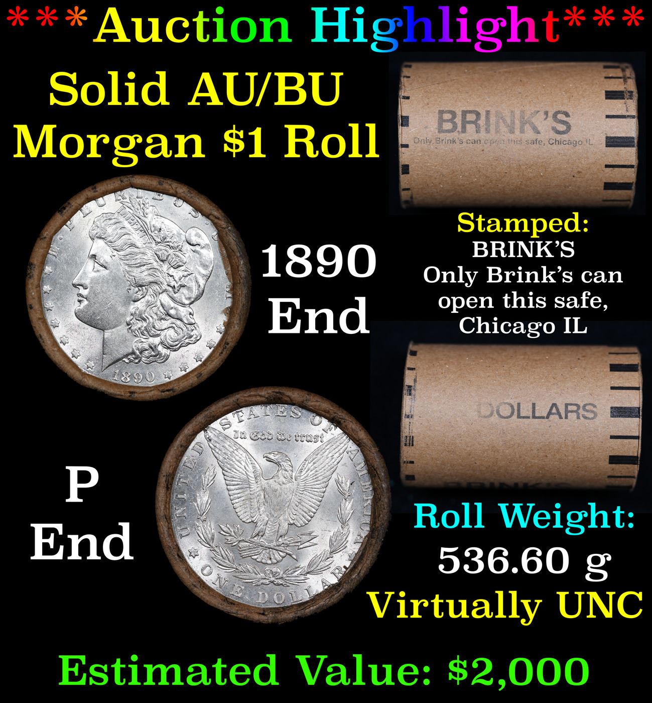 ***Auction Highlight*** AU/BU Slider Brinks Shotgun Morgan $1 Roll 1890 & P Ends Virtually UNC. Up For Auction Is a Very Near Solid Uncirculated Morgan Dollar Roll In an old Brinks Wrapper with Tight Shotgun Ends. This Roll is filled with Virtually all Uncirculated Silver Dollars. This is how we determined that. A Uncirculated Morgan Dollar a Weights 26.73 Grams. So 20 of them would weigh, 534.6 Grams. Our Uncirculated Roll Weighs 536.7 Grams, so the Wrappers weigh 2.1 Grams. The Roll at hand weighs 536.60 Grams. Deducting the Wrapper Weight of 2.1 Grams, the average coin in this roll weights 26.72 Grams. Your going to find in this roll a lot of Uncirculated coins and a few sliders. This is a Very Near Solid roll of Uncirculated Morgan Dollars.