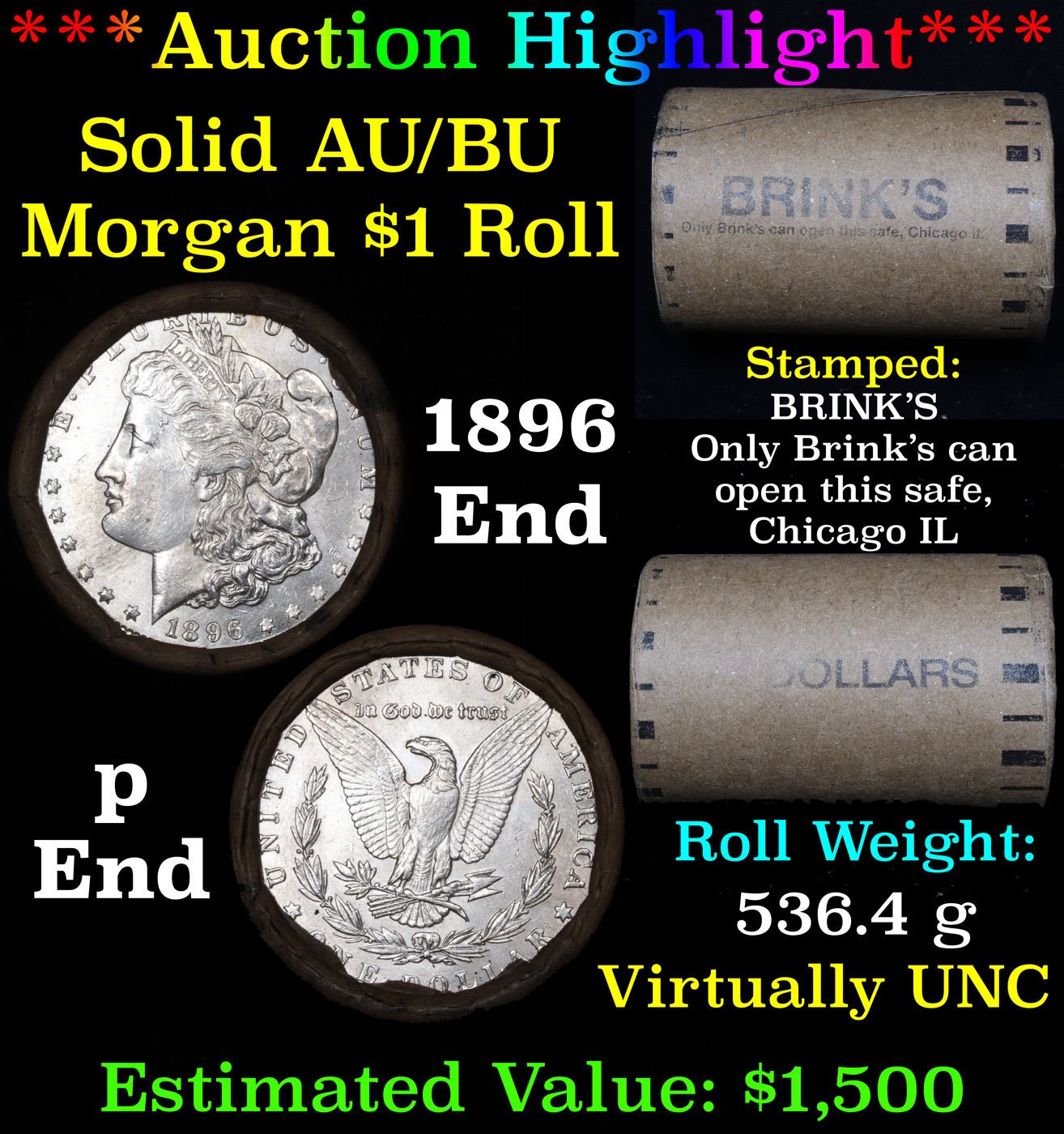 ***Auction Highlight*** AU/BU Slider Brinks Shotgun Morgan $1 Roll 1896 & P Ends Virtually UNC