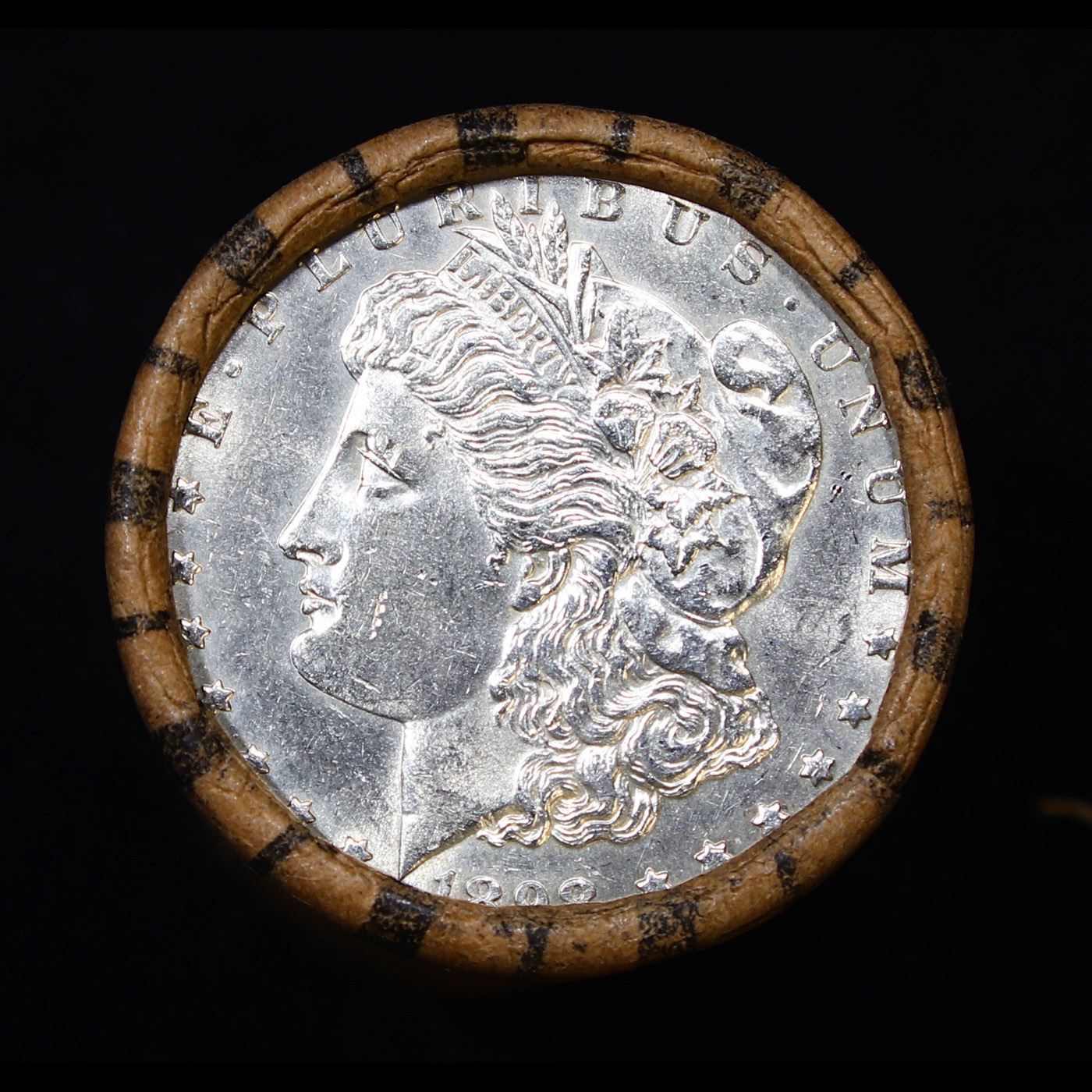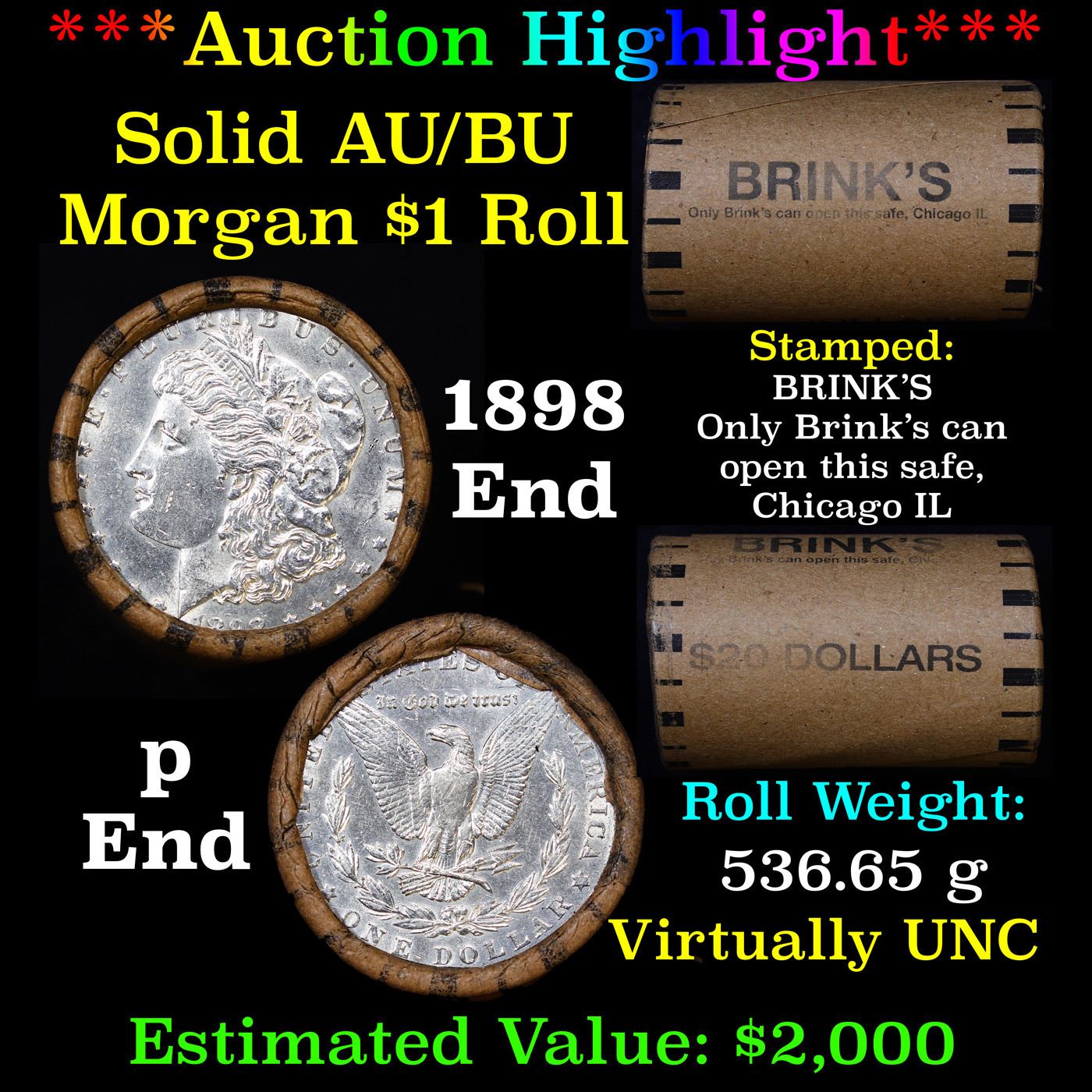 ***Auction Highlight*** AU/BU Slider Brinks Shotgun Morgan $1 Roll 1898 & P Ends Virtually UNC. Up For Auction Is a Very Near Solid Uncirculated Morgan Dollar Roll In an old Brinks Wrapper with Tight Shotgun Ends. This Roll is filled with Virtually all Uncirculated Silver Dollars. This is how we determined that. A Uncirculated Morgan Dollar a Weights 26.73 Grams. So 20 of them would weigh, 534.6 Grams. Our Uncirculated Roll Weighs 536.7 Grams, so the Wrappers weigh 2.1 Grams. The Roll at hand weighs 536.65 Grams. Deducting the Wrapper Weight of 2.1 Grams, the average coin in this roll weights 26.72 Grams. Your going to find in this roll a lot of Uncirculated coins and a few sliders. This is a Very Near Solid roll of Uncirculated Morgan Dollars.