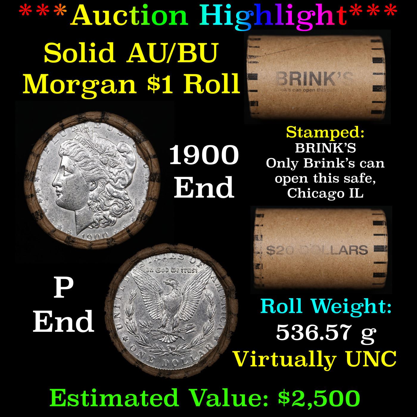 ***Auction Highlight*** AU/BU Slider Brinks Shotgun Morgan $1 Roll 1900 & P Ends Virtually UNC (fc)