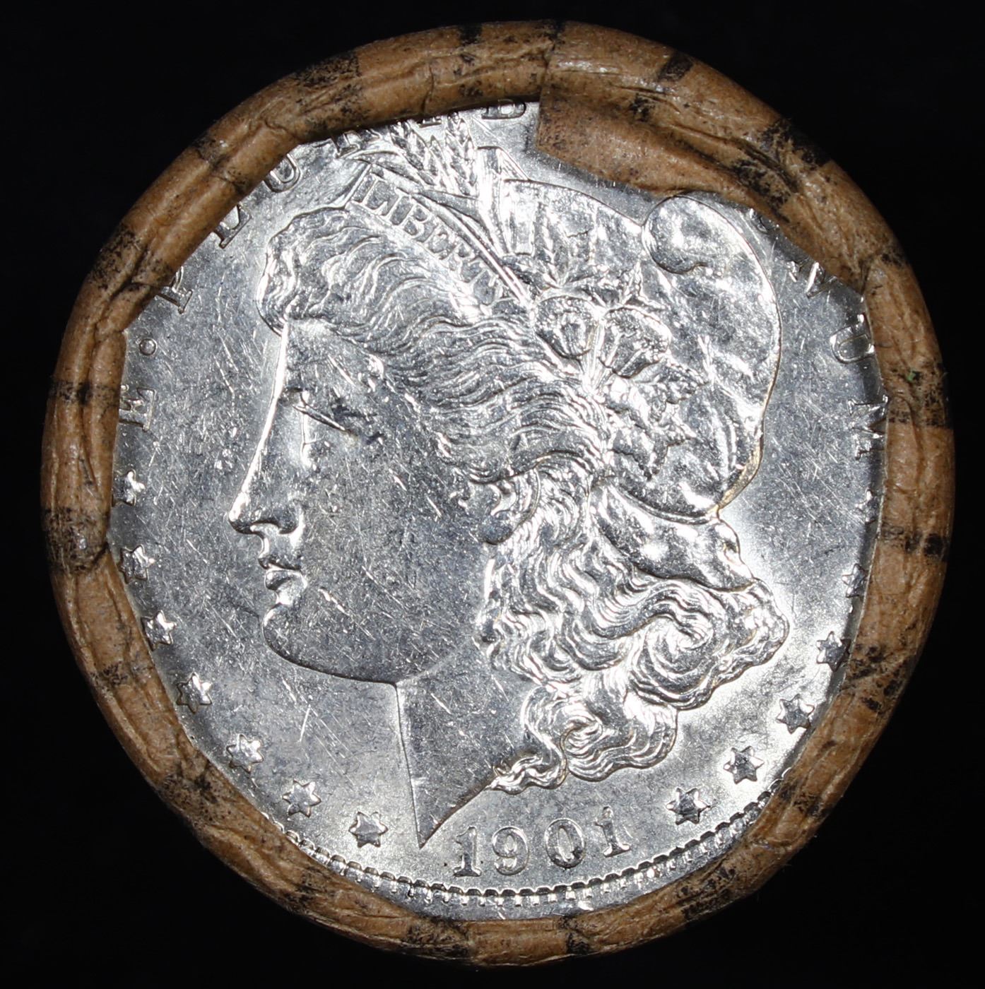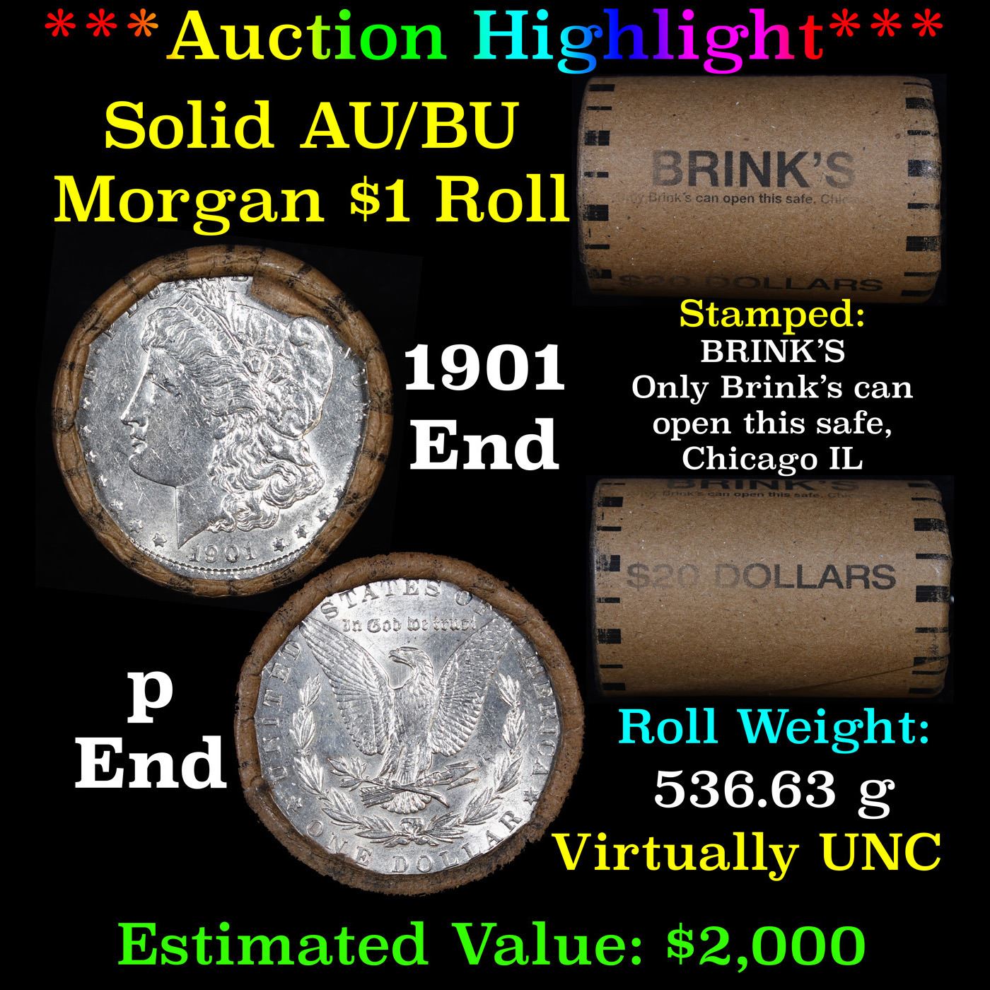 ***Auction Highlight*** AU/BU Slider Brinks Shotgun Morgan $1 Roll 1901 & P Ends Virtually UNC. Up For Auction Is a Very Near Solid Uncirculated Morgan Dollar Roll In an old Brinks Wrapper with Tight Shotgun Ends. This Roll is filled with Virtually all Uncirculated Silver Dollars. This is how we determined that. A Uncirculated Morgan Dollar a Weights 26.73 Grams. So 20 of them would weigh, 534.6 Grams. Our Uncirculated Roll Weighs 536.7 Grams, so the Wrappers weigh 2.1 Grams. The Roll at hand weighs 536.63 Grams. Deducting the Wrapper Weight of 2.1 Grams, the average coin in this roll weights 26.72 Grams. Your going to find in this roll a lot of Uncirculated coins and a few sliders. This is a Very Near Solid roll of Uncirculated Morgan Dollars.