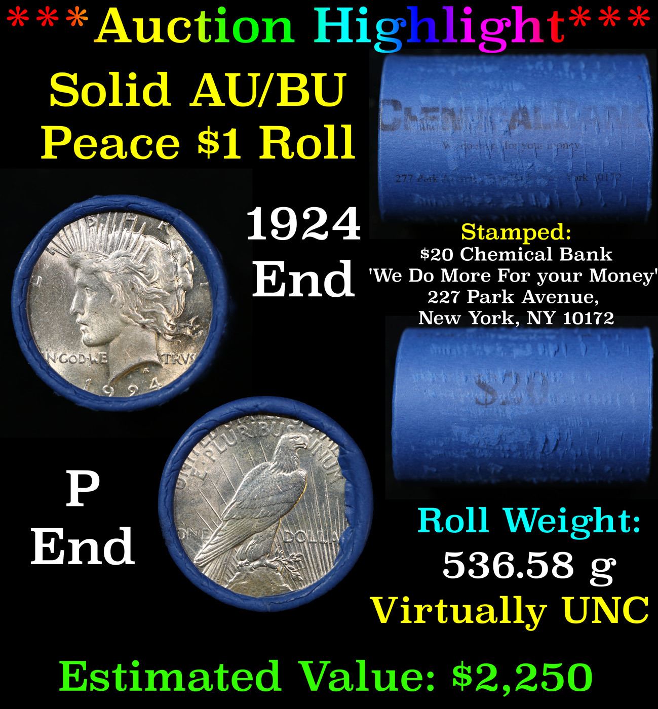 ***Auction Highlight*** AU/BU Slider Chemical Bank Shotgun Peace $1 Roll 1924 & P Ends Virtually UNC. Up For Auction Is a Very Near Solid Uncirculated Peace Dollar Roll In an old Chemical Bank 'We Do More For your Money' 227 Park Avenue, New York, NY 10172 Wrapper with Tight Shotgun Ends. This Roll is filled with Virtually all Uncirculated Silver Dollars. This is how we determined that. A Uncirculated Peace Dollar a Weights 26.73 Grams. So 20 of them would weigh, 534.6 Grams. Our Uncirculated Roll Weighs 536.7 Grams, so the Wrappers weigh 2.1 Grams. The Roll at hand weighs 536.58 Grams. Deducting the Wrapper Weight of 2.1 Grams, the average coin in this roll weights 26.72 Grams. Your going to find in this roll a lot of Uncirculated coins and a few sliders. This is a Very Near Solid roll of Uncirculated Peace Dollars.