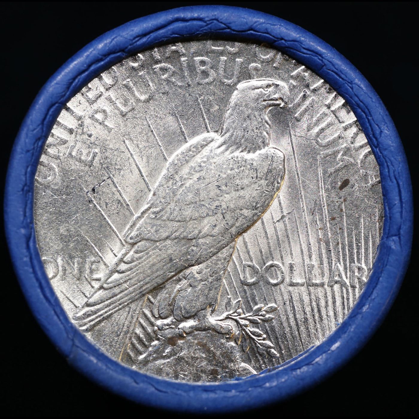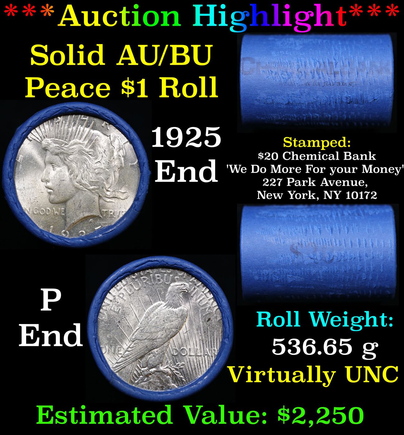 ***Auction Highlight*** AU/BU Slider Chemical Bank Shotgun Peace $1 Roll 1925 & P Ends Virtually UNC. Up For Auction Is a Very Near Solid Uncirculated Peace Dollar Roll In an old Chemical Bank 'We Do More For your Money' 227 Park Avenue, New York, NY 10172 Wrapper with Tight Shotgun Ends. This Roll is filled with Virtually all Uncirculated Silver Dollars. This is how we determined that. A Uncirculated Peace Dollar a Weights 26.73 Grams. So 20 of them would weigh, 534.6 Grams. Our Uncirculated Roll Weighs 536.7 Grams, so the Wrappers weigh 2.1 Grams. The Roll at hand weighs 536.65 Grams. Deducting the Wrapper Weight of 2.1 Grams, the average coin in this roll weights 26.72 Grams. Your going to find in this roll a lot of Uncirculated coins and a few sliders. This is a Very Near Solid roll of Uncirculated Peace Dollars.