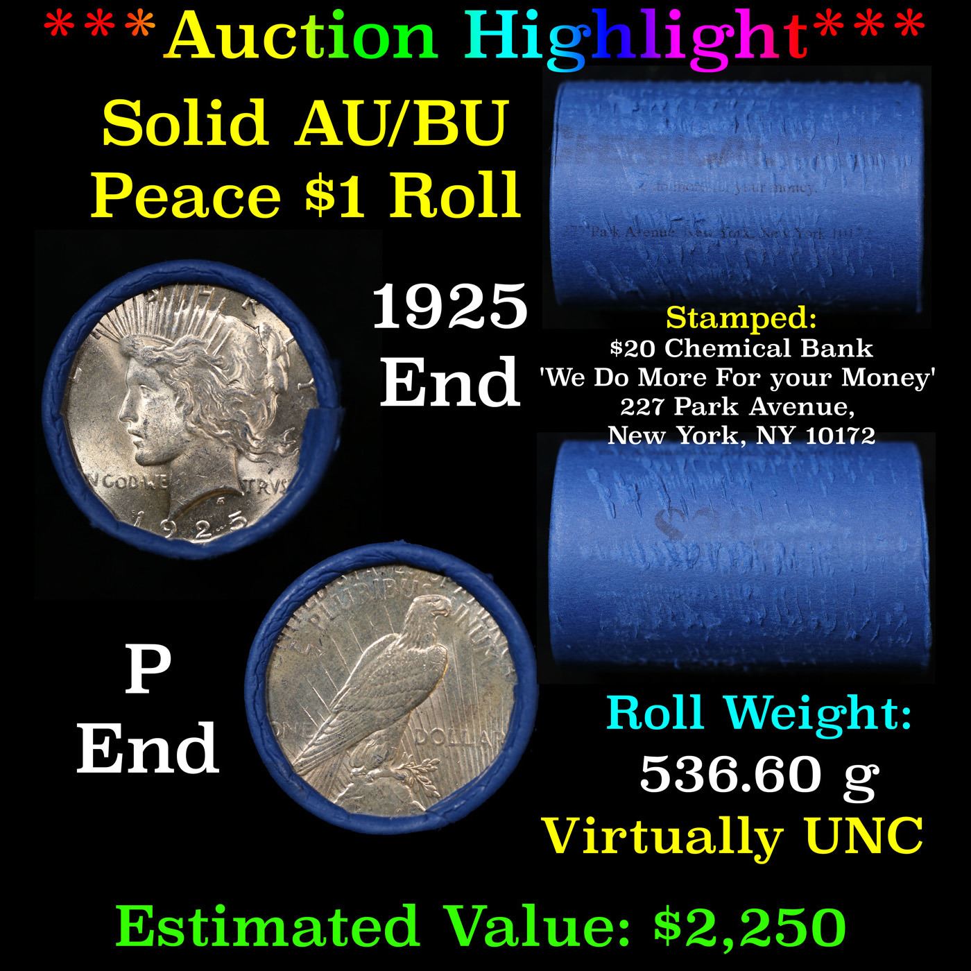 ***Auction Highlight*** AU/BU Slider Chemical Bank Shotgun Peace $1 Roll 1925 & P Ends Virtually UNC. Up For Auction Is a Very Near Solid Uncirculated Peace Dollar Roll In an old Chemical Bank 'We Do More For your Money' 227 Park Avenue, New York, NY 10172 Wrapper with Tight Shotgun Ends. This Roll is filled with Virtually all Uncirculated Silver Dollars. This is how we determined that. A Uncirculated Peace Dollar a Weights 26.73 Grams. So 20 of them would weigh, 534.6 Grams. Our Uncirculated Roll Weighs 536.7 Grams, so the Wrappers weigh 2.1 Grams. The Roll at hand weighs 536.60 Grams. Deducting the Wrapper Weight of 2.1 Grams, the average coin in this roll weights 26.72 Grams. Your going to find in this roll a lot of Uncirculated coins and a few sliders. This is a Very Near Solid roll of Uncirculated Peace Dollars.
