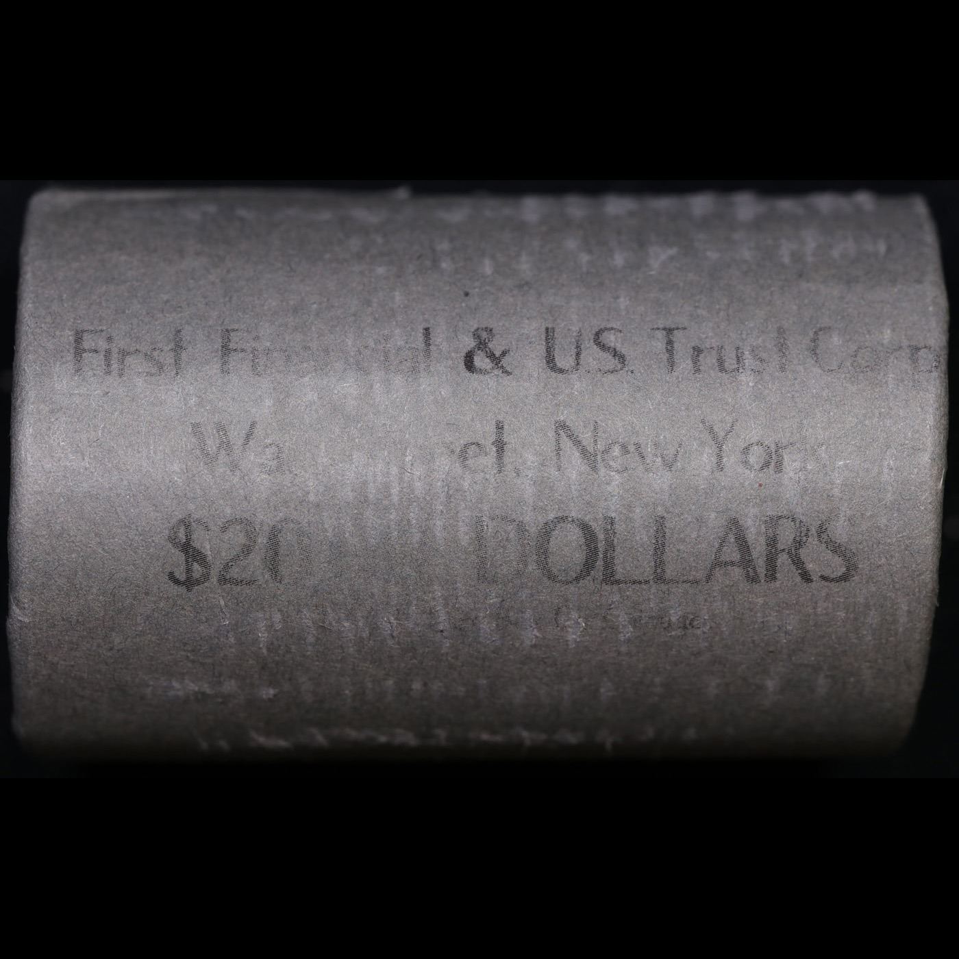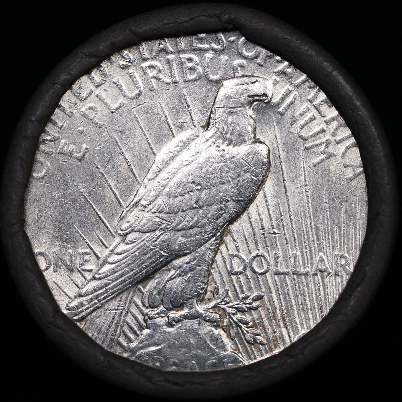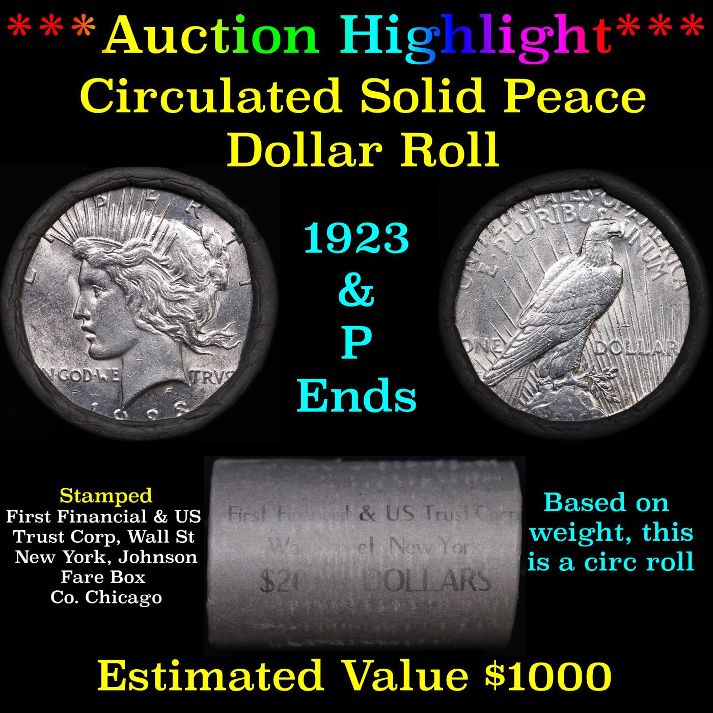 ***Auction Highlight*** AU/BU Slider First Financial Shotgun Peace $1 Roll 1923 & 'P' Ends Virtually UNC. Up For Auction Is a Very Near Solid Uncirculated Peace Dollar Roll In an old First Financial & US Trust Corp, Wall St New York, Johgnson Fare Box Co. Chicago Wrapper with Tight Shotgun Ends. This is how we determined that. A Uncirculated Peace Dollar a Weights 26.73 Grams. So 20 of them would weigh, 534.6 Grams. Our Uncirculated Roll Weighs 536.7 Grams, so the Wrappers weigh 2.1 Grams. The Roll at hand weighs 536.65 Grams. Deducting the Wrapper Weight of 2.1 Grams, the average coin in this roll weights 26.72 Grams. Your going to find in this roll a lot of Uncirculated coins and a few sliders. This is a Very Near Solid roll of Uncirculated Peace Dollars.