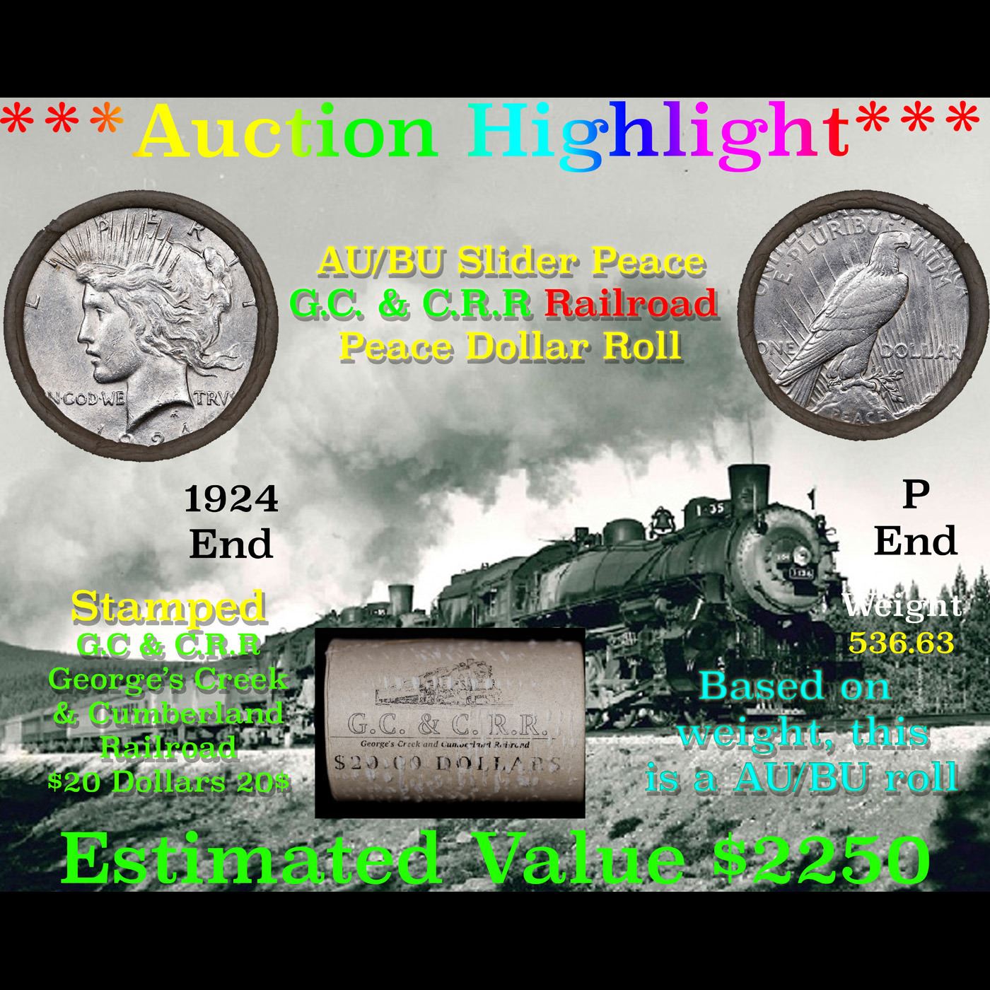 ***Auction Highlight*** AU/BU Slider GC CRR Shotgun Peace $1 Roll 1924 & P Ends Virtually UNC. Up For Auction Is a Very Near Solid Uncirculated Peace Dollar Roll In an old George Creek and cumberland Railroad Wrapper with Tight Shotgun Ends. This Roll is filled with Virtually all Uncirculated Silver Dollars. This is how we determined that. A Uncirculated Peace Dollar a Weights 26.73 Grams. So 20 of them would weigh, 534.6 Grams. Our Uncirculated Roll Weighs 536.7 Grams, so the Wrappers weigh 2.1 Grams. The Roll at hand weighs 536.63 Grams. Deducting the Wrapper Weight of 2.1 Grams, the average coin in this roll weights 26.72 Grams. Your going to find in this roll a lot of Uncirculated coins and a few sliders. This is a Very Near Solid roll of Uncirculated Peace Dollars.