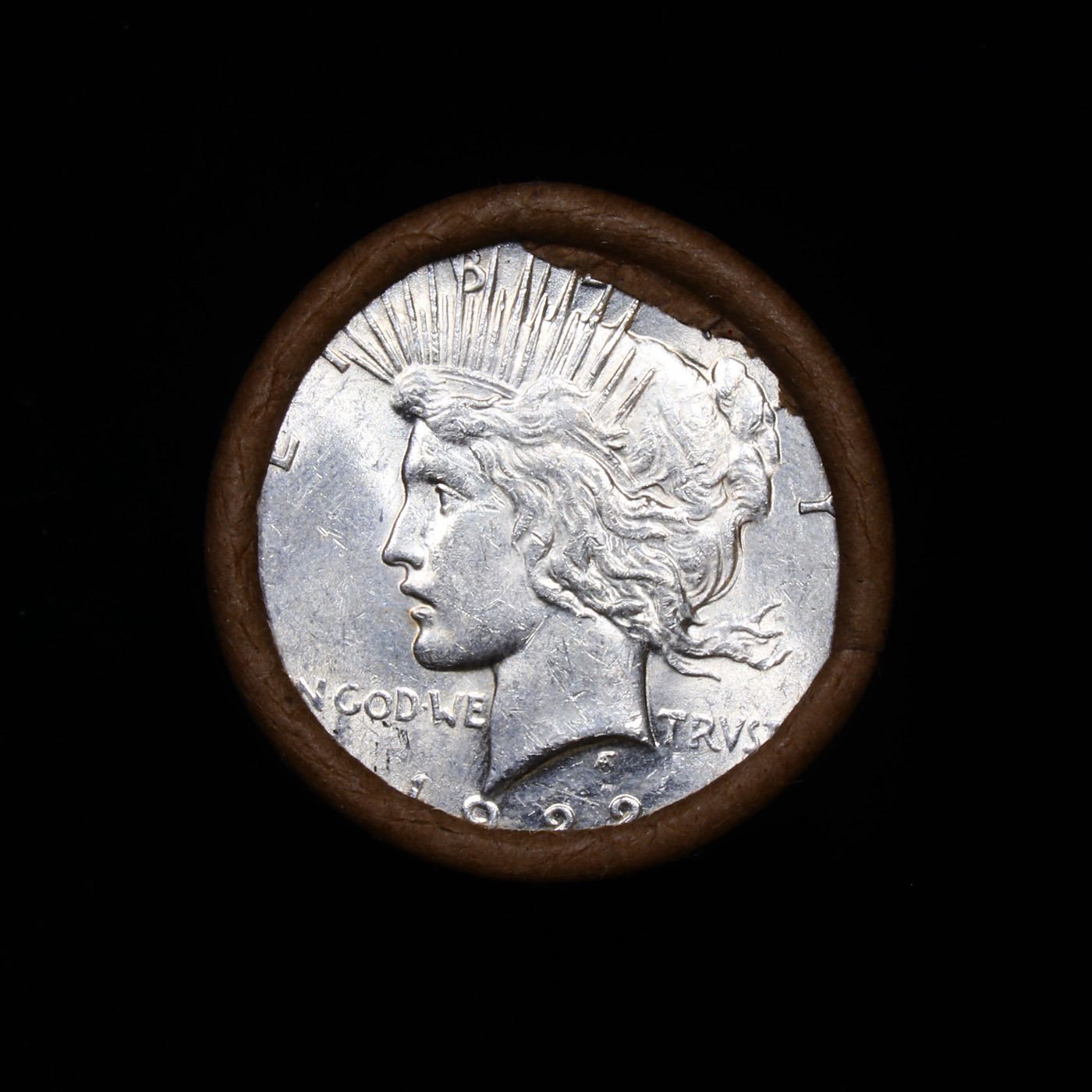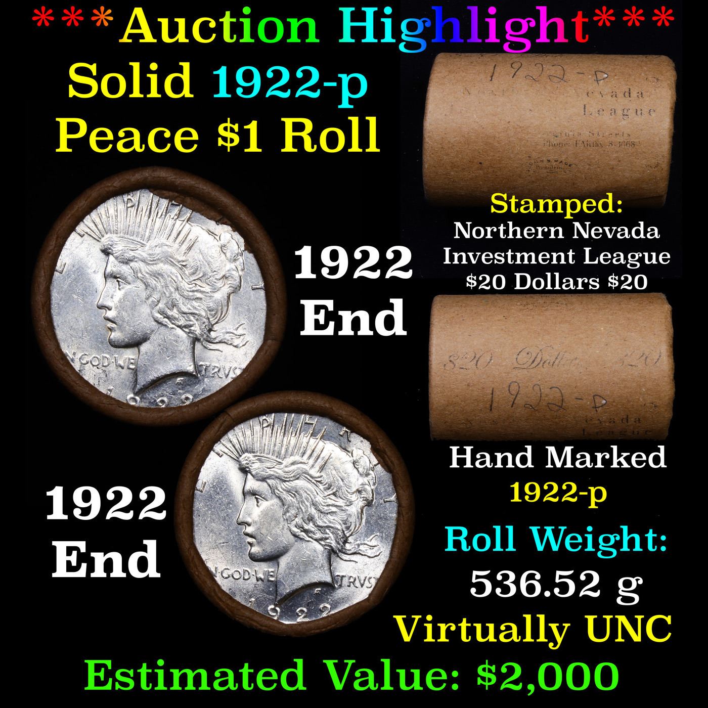 ***Auction Highlight*** AU/BU Slider Norther Nevada Shotgun Solid Date Peace $1 Roll 1922-p Virtually UNC. Up For Auction Is a Very Near Solid Uncirculated 1922 Peace Dollar Roll In an old Norther Nevada investment Wrapper with Tight Shotgun Ends. This Roll is filled with Virtually all Uncirculated Silver Dollars. This is how we determined that. A Uncirculated Peace Dollar a Weights 26.73 Grams. So 20 of them would weigh, 534.6 Grams. Our Uncirculated Roll Weighs 536.7 Grams, so the Wrappers weigh 2.1 Grams. The Roll at hand weighs 536.52 Grams. Deducting the Wrapper Weight of 2.1 Grams, the average coin in this roll weights 26.71 Grams. Your going to find in this roll a lot of Uncirculated coins and a few sliders. This is a Very Near Solid roll of Uncirculated Peace Dollars.