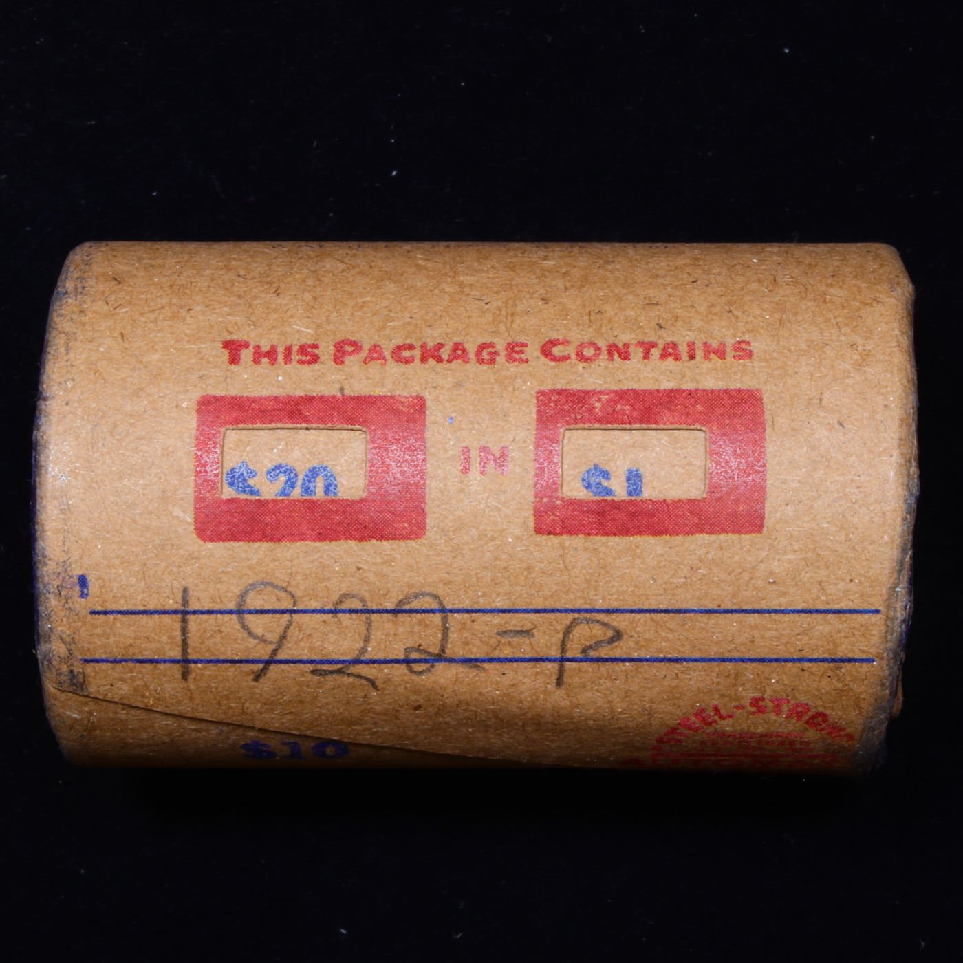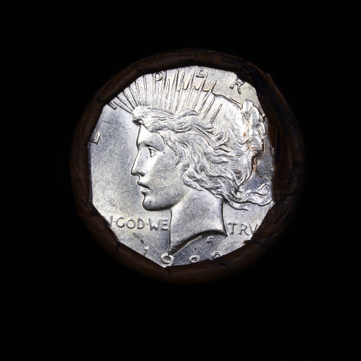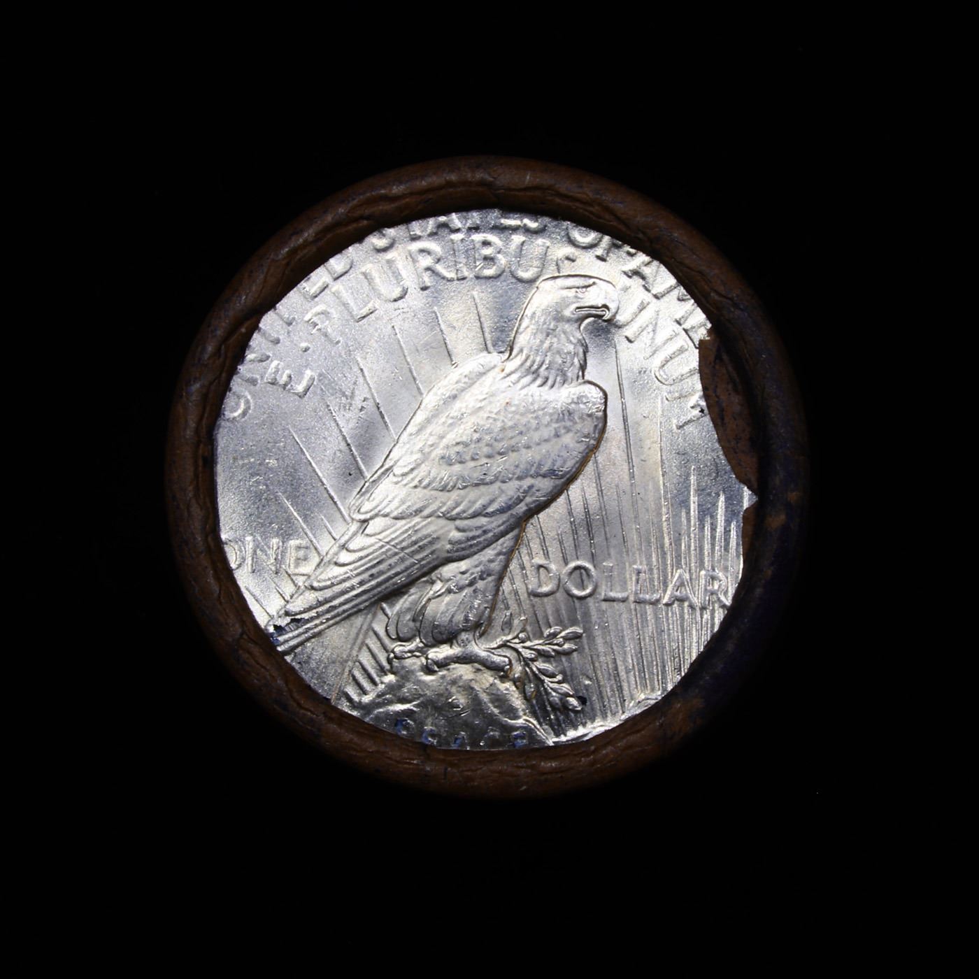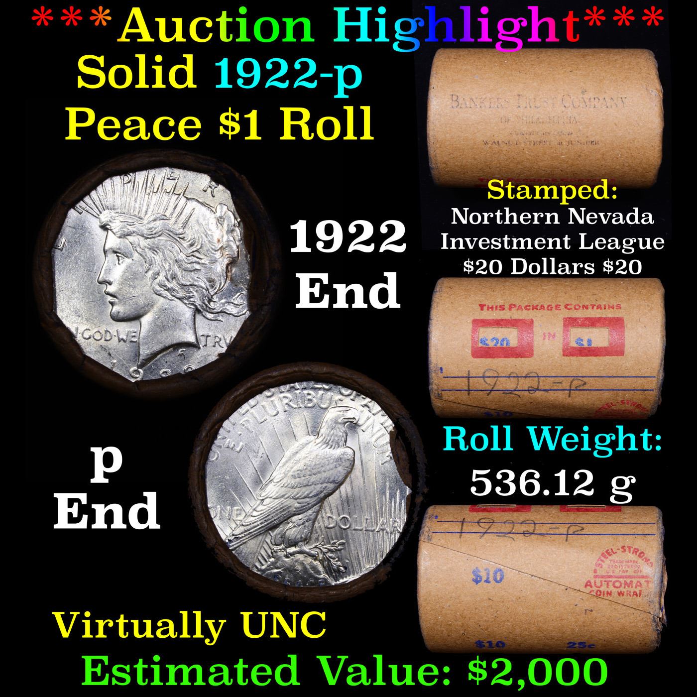 ***Auction Highlight*** AU/BU Slider Northern Nevada Shotgun Solid Date Peace $1 Roll 1922-p Virtually UNC. Up For Auction Is a Very Near Solid Uncirculated 1922-p Peace Dollar Roll In an old Northern Nevada Investment League Wrapper with Tight Shotgun Ends. This Roll is filled with Virtually all Uncirculated Silver Dollars. This is how we determined that. A Uncirculated Peace Dollar a Weights 26.73 Grams. So 20 of them would weigh, 534.6 Grams. Our Uncirculated Roll Weighs 536.7 Grams, so the Wrappers weigh 2.3 Grams. The Roll at hand weighs 536.12 Grams. Deducting the Wrapper Weight of 2.3 Grams, the average coin in this roll weights 26.71 Grams. Your going to find in this roll a lot of Uncirculated coins and a few sliders. This is a Very Near Solid roll of Uncirculated Peace Dollars. Trends au58 $40, ms60 $42