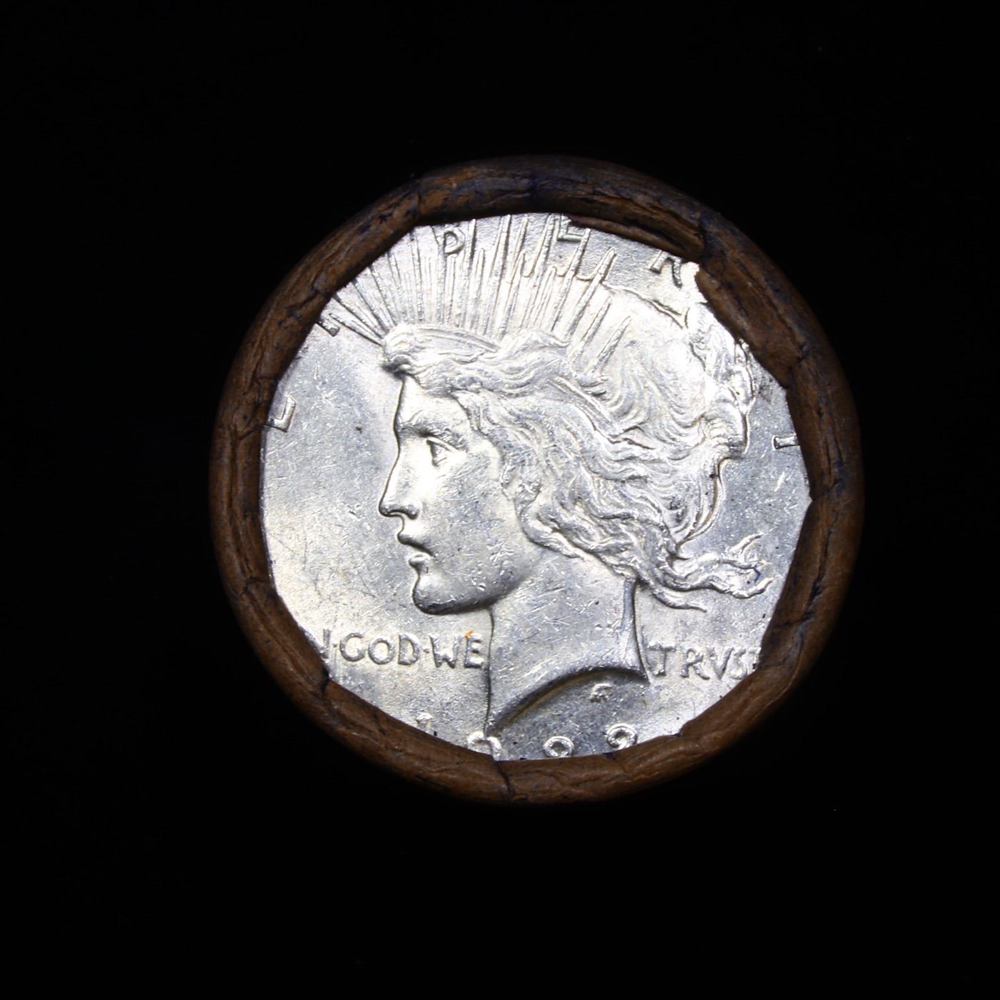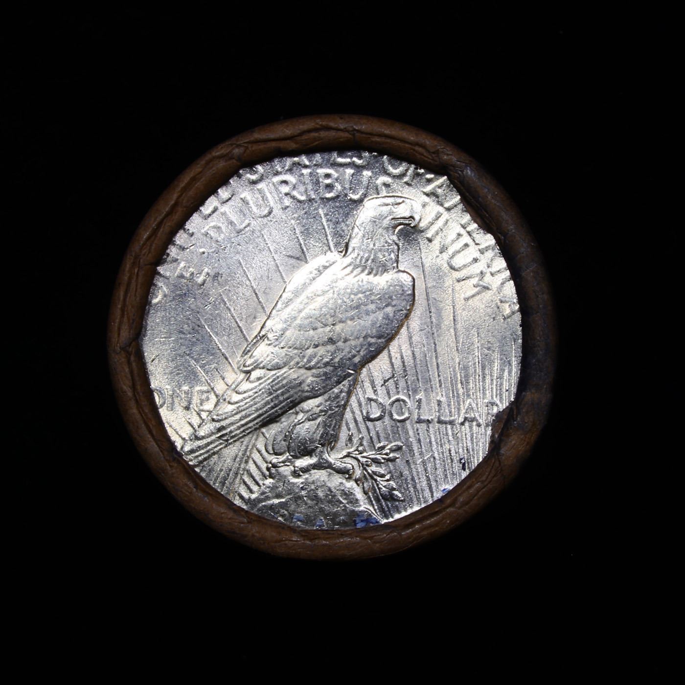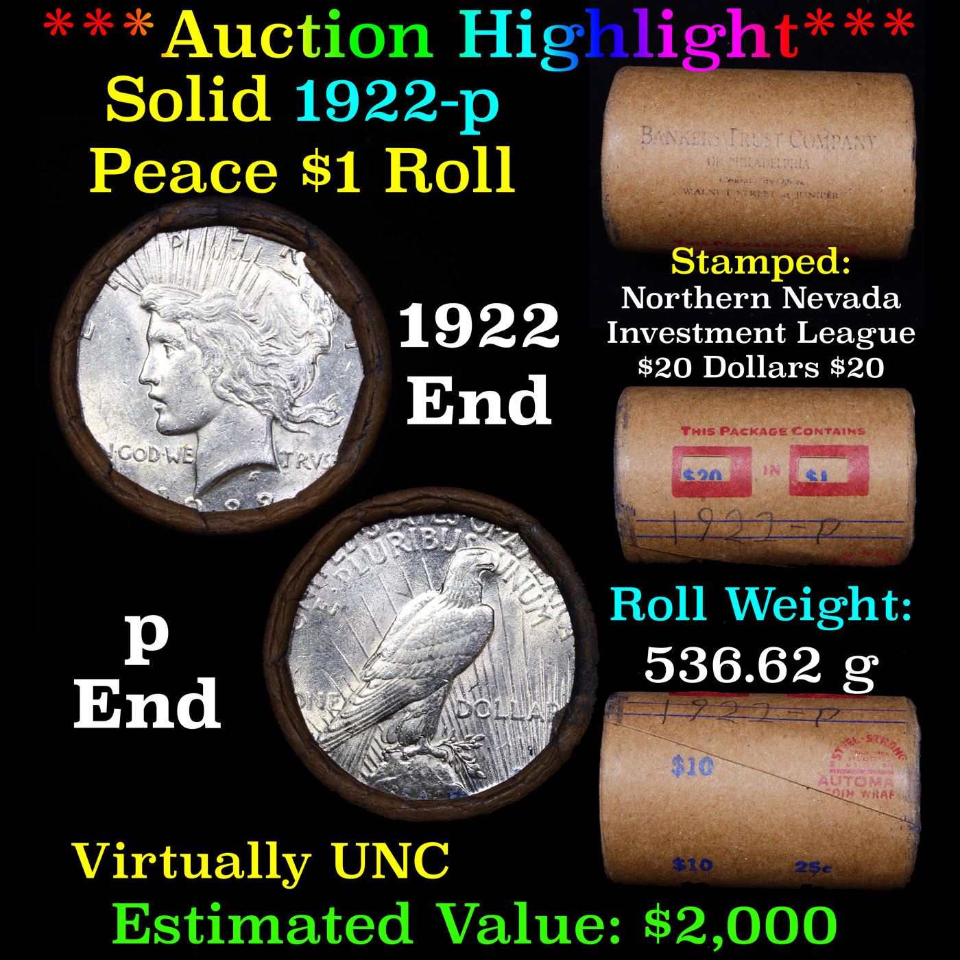 ***Auction Highlight*** AU/BU Slider Northern Nevada Shotgun Solid Date Peace $1 Roll 1922-p Virtually UNC. Up For Auction Is a Very Near Solid Uncirculated 1922-p Peace Dollar Roll In an old Northern Nevada Investment League Wrapper with Tight Shotgun Ends. This Roll is filled with Virtually all Uncirculated Silver Dollars. This is how we determined that. A Uncirculated Peace Dollar a Weights 26.73 Grams. So 20 of them would weigh, 534.6 Grams. Our Uncirculated Roll Weighs 536.7 Grams, so the Wrappers weigh 2.3 Grams. The Roll at hand weighs 536.62 Grams. Deducting the Wrapper Weight of 2.3 Grams, the average coin in this roll weights 26.71 Grams. Your going to find in this roll a lot of Uncirculated coins and a few sliders. This is a Very Near Solid roll of Uncirculated Peace Dollars. Trends au58 $40, ms60 $42