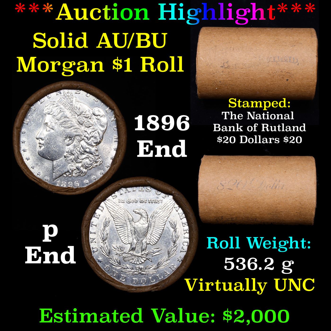 ***Auction Highlight*** AU/BU Slider Rutland Shotgun Morgan $1 Roll 1896 & P Ends Virtually UNC. Up For Auction Is a Very Near Solid Uncirculated Morgan Dollar Roll In an old National Bank Of Rutland Wrapper with Tight Shotgun Ends. This Roll is filled with Virtually all Uncirculated Silver Dollars. This is how we determined that. A Uncirculated Morgan Dollar a Weights 26.73 Grams. So 20 of them would weigh, 534.6 Grams. Our Uncirculated Roll Weighs 536.7 Grams, so the Wrappers weigh 2.1 Grams. The Roll at hand weighs 536.2 Grams. Deducting the Wrapper Weight of 2.1 Grams, the average coin in this roll weights 26.7 Grams. Your going to find in this roll a lot of Uncirculated coins and a few sliders. This is a Very Near Solid roll of Uncirculated Morgan Dollars.