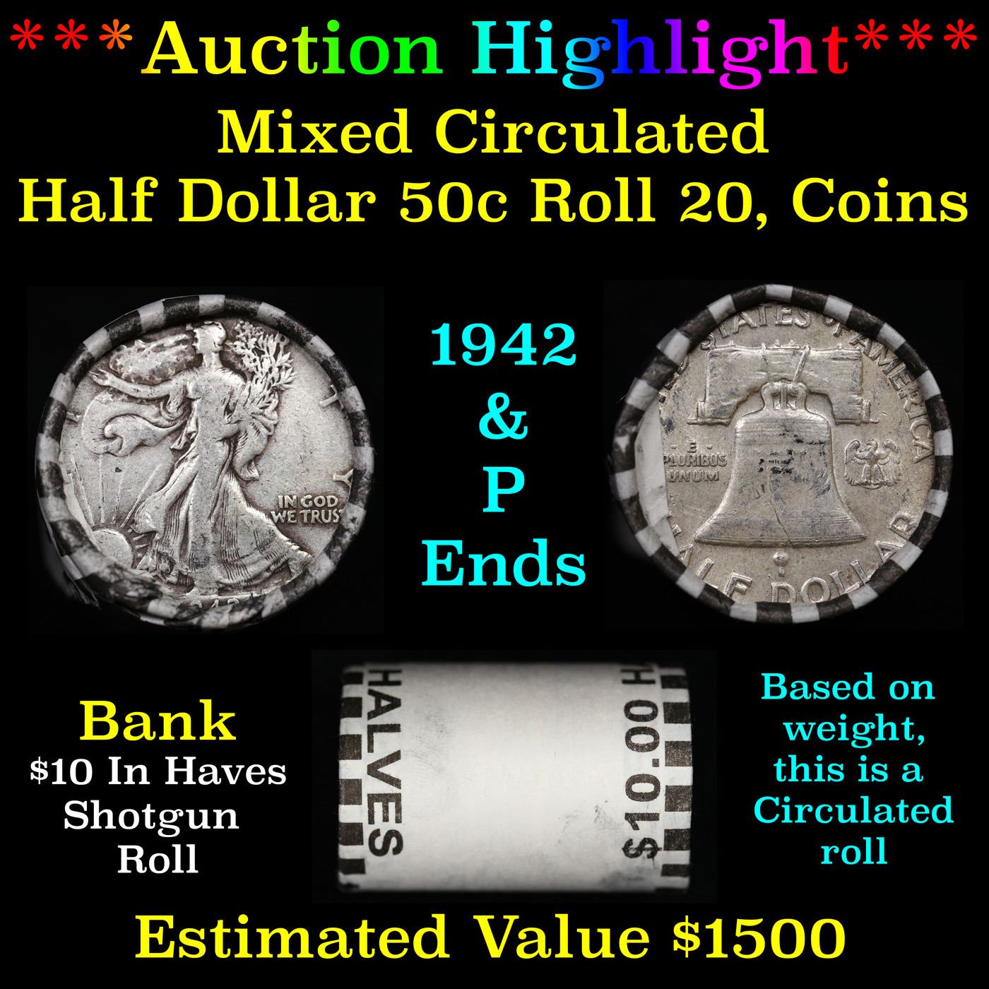 ***Auction Highlight*** Bank 50c Shotgun Roll $10 Halves 20 Coins in an old bank wrapper p Franklin & 1942 Walker Ends. Up for auction is a Consignment I have secured a collection of old 1960’s Bank wrapped Half Dollar Shot Gun Rolls from various Banks. These Rolls contain 20 Half Dollars. They have tight ends and are wild!. I opened three rolls to examine the contents and what I found was mostly Circulated Walkers, a few Franklins and a Seated coin or two and a couple of kennedys. But The consignee has given us some additional rolls. We estimate the rolls to be worth $2000 each as a collectable Alone, but if the roll is opened and has a rare date, who knows the value, a 1921 Walker even in low grade is worth over $500, and several other dates are worth over $200 each. But who knows, maybe a rare 1878-s Seated is inside. ($35k in g4), or an 1892-o Barber ($5k in G4). In any event the rolls themselves are amazing collectibles of a bygone era. Good Luck.