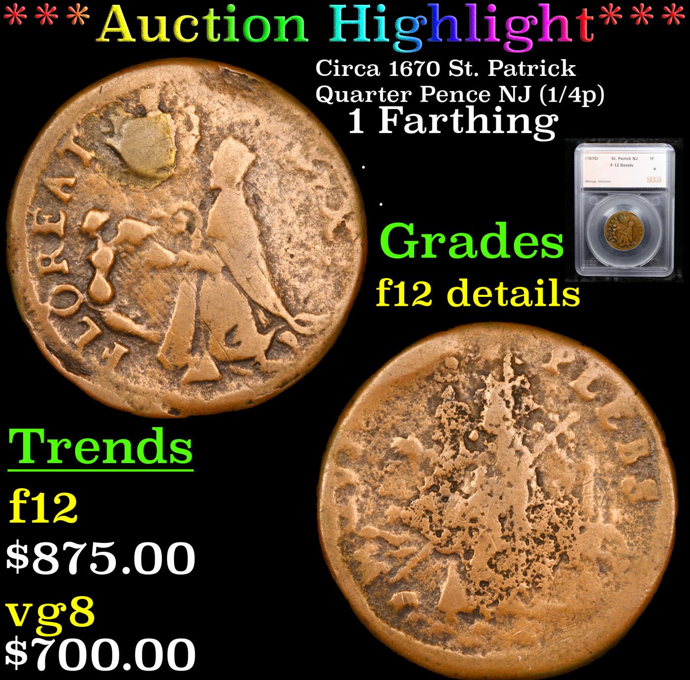 ***Auction Highlight*** Circa 1670 St. Patrick Quarter Pence NJ (1/4p) Graded f12 details By SEGS (f