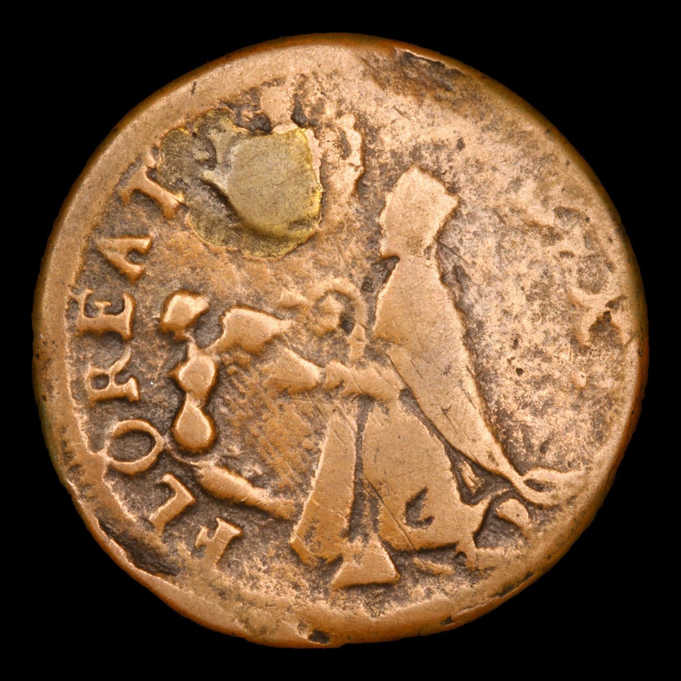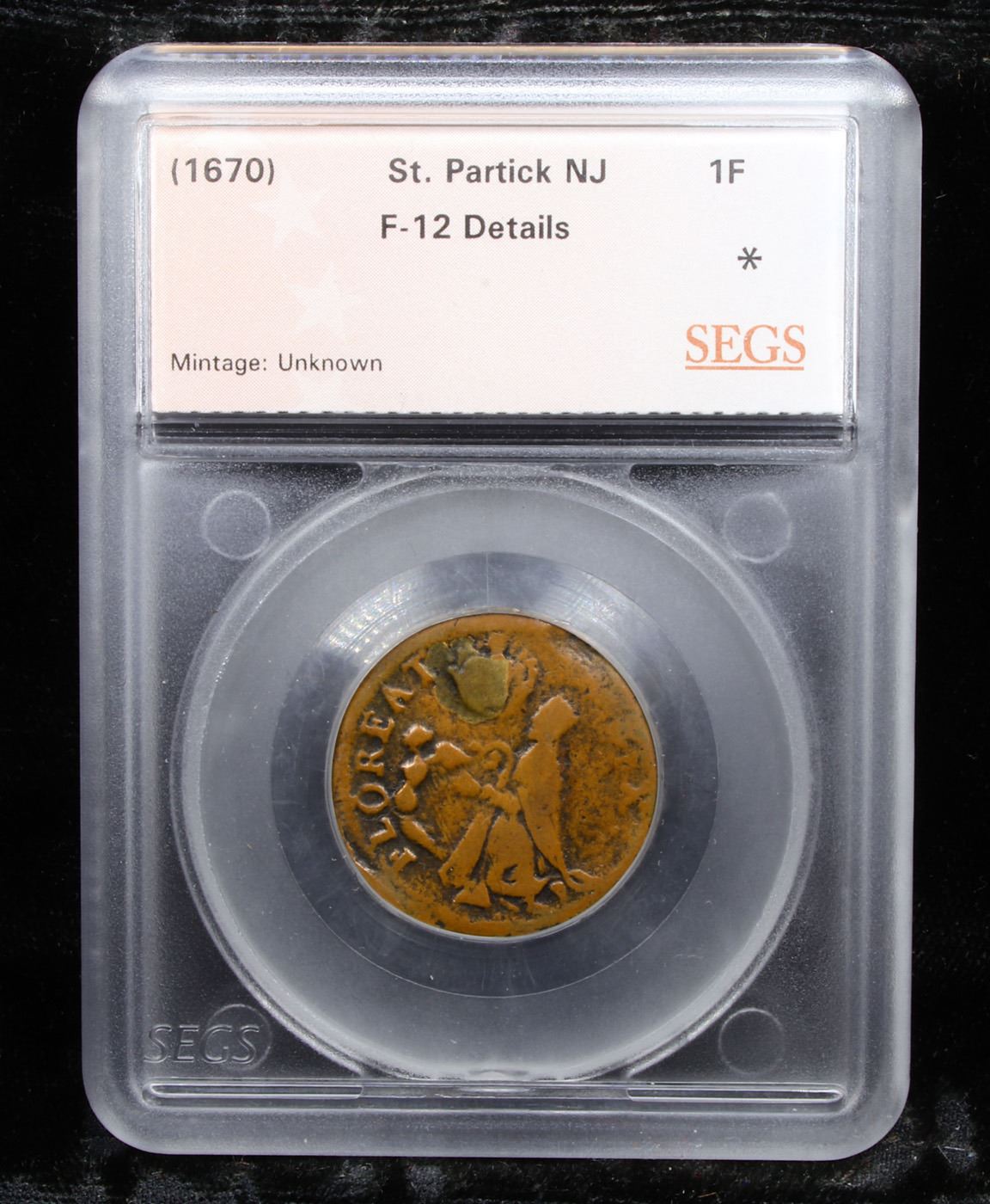 ***Auction Highlight*** Circa 1670 St. Patrick Quarter Pence NJ (1/4p) Graded f12 details By SEGS. Up for Auction is the Ultra Rare New Jersey Colonial ÒSaint PatrickÓ Farthing. 86.0 grains. There is considerable gloss to both sides of this antique copper and medium brown St. Patrick's farthing. Central detail is suitably bold, although less-than-perfect centering, uneven wear, and roughness in the planchet have obscured the peripheral detail along the right obverse, and lower right reverse borders. The Masonic punctuation in the form of three dots is faint, yet discernible on the obverse after the word REX. All in all, a relatively pleasing circulated example of this challenging early colonial era type.