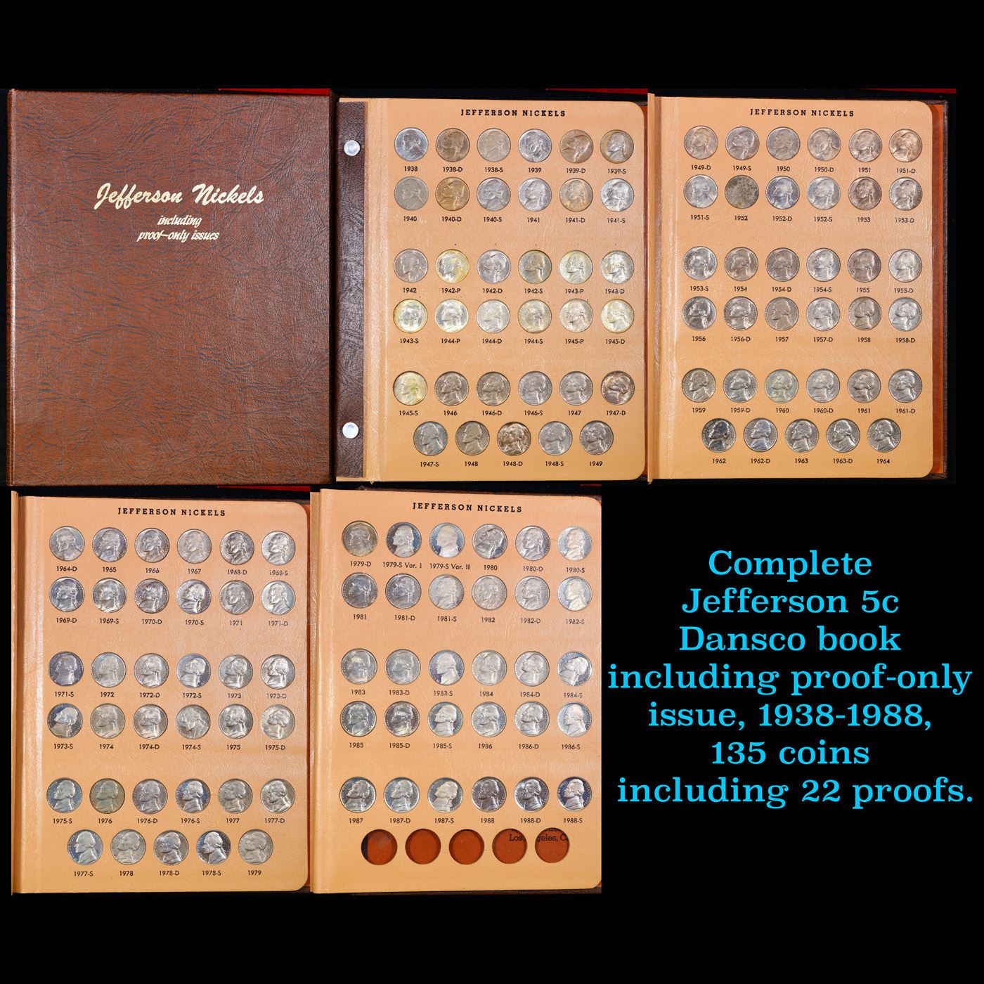 ***Auction Highlight*** Complete Jefferson 5c Dansco book including proof-only issue, 1938-1988, 135 coins including 22 proofs.. All coins encased in a nice Dansco Jefferson Nickle book. Date Range from 1938-1988. A fantastic grouping of 135 coins including 22 proofs. Has Not Been Checked For Full Steps
