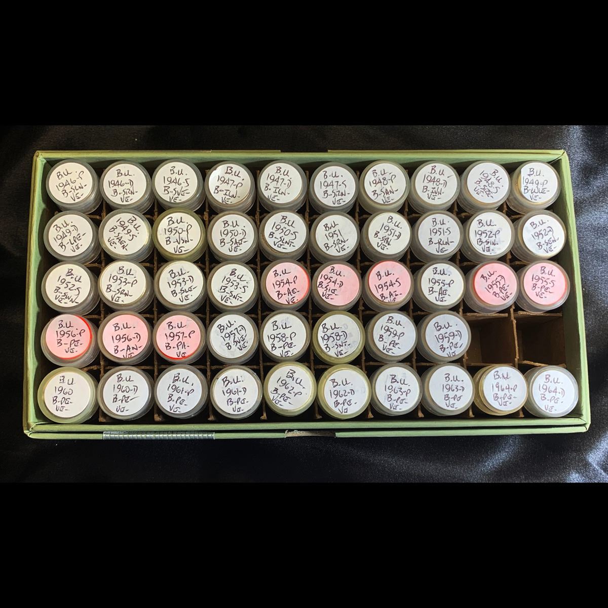 ***Auction Highlight*** Complete Silver Roosevelt Dime 10c Roll set, 2400 coins. Complete UNSEARCHED Gem roll set of Silver Roosevelt dimes. 48 rolls, every date and mint mark from 1946-1964. That's a total of 2400 coins. WOW!! The rolls have not been searched for varieties, errors or FT (Full Torch). A few notes on some of these dates, The 1949-s trends $29 in ms64, the 1951-s trends $25 in ms64. Full Torch examples are roughly double a regular one. A 1963-p ms67 FT trends $1000. There are some incredibly rare varieties in the Roosevelts. Hours and hours of fun to look through and see what discoveries you find in this treasure. You may never find this again and putting this together yourself could take years. 1 set of 48 regular examples trends $544.50 in ms64. That makes trends for the roll set with no full torch or varieties in ms64 $27,225. That is ms64 and this is a Gem set.