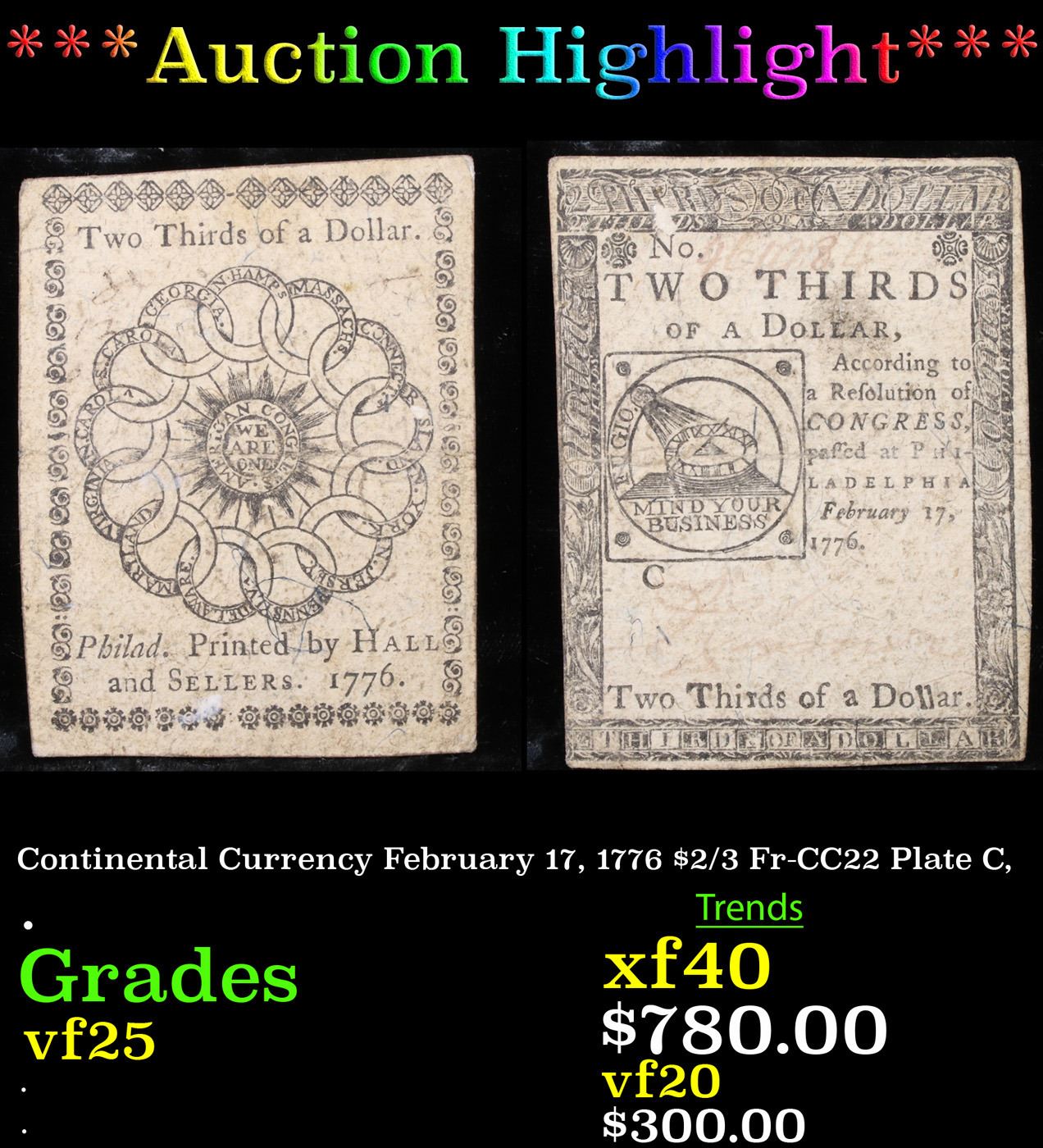 ***Auction Highlight*** Continental Currency February 17, 1776 $2/3 Fr-CC22 Plate C, Grades vf+. This is the only Continental issue that contained these Fractional denominations. They are extremely popular with collectors, largely due to the use of Ben Franklin's sundial vignette on the face and the thirteen chain links, containing the names of the original colonies, surrounding "We are One" on the back. These devices were adapted for the 1776 Continental Dollar coins and the 1787 Fugio Cent. THis Note is Signed By Benjamin Brannan In Red ink. An emission totaling $4,000,000 payable in Spanish milled dollars, or the equivalent in gold or silver, was authorized by the Continental Congress resolution of February 10, 1776. Of this $1,000,000 was reserved for the first national fractional currency. The front design on the fractional notes includes the first use of the "FUGIO" (I fly) legend and sundial as well as the "Mind your Business" legend. The back shows the thirteen linked rings representing the colonies and the legends "We are one" and "American Congress". Eric Newman has discovered these designs were created by Benjamin Franklin (see his indispensable The Early Paper Money of America p. 53). Note that on the fractional bills the dots in the corners of the front design reflect the denomination, with one dot designating a sixth of a dollar, two dots for a third, three dots for $1/2 and four dots for $2/3. Also, fractional denominations come in plates A, B and C. Again it was Newman who discovered the devices and border designs for the fractional bills were cut by Elisha Gallaudet, who also designed the Continental Currency coin. There is one signer, in red ink, on the fractional bills and two signers, using red and brown ink, on the dollar denominations. Counterfeit detectors for the dollar denominations were made on blue paper. The Franklin designs were adopted for the Continental Currency coin made a few months later and for the 1787 Fugio cents. The paper, made at Ivy Mills in Chester County, Pennsylvania, contained blue fibers and mica flakes. Printed by Hall and Sellers in Philadelphia. Denominations printed were the: $1/6, $1/3, $1/2, $2/3, $1, $2, $3, $4, $5, $6, $7 and $8.