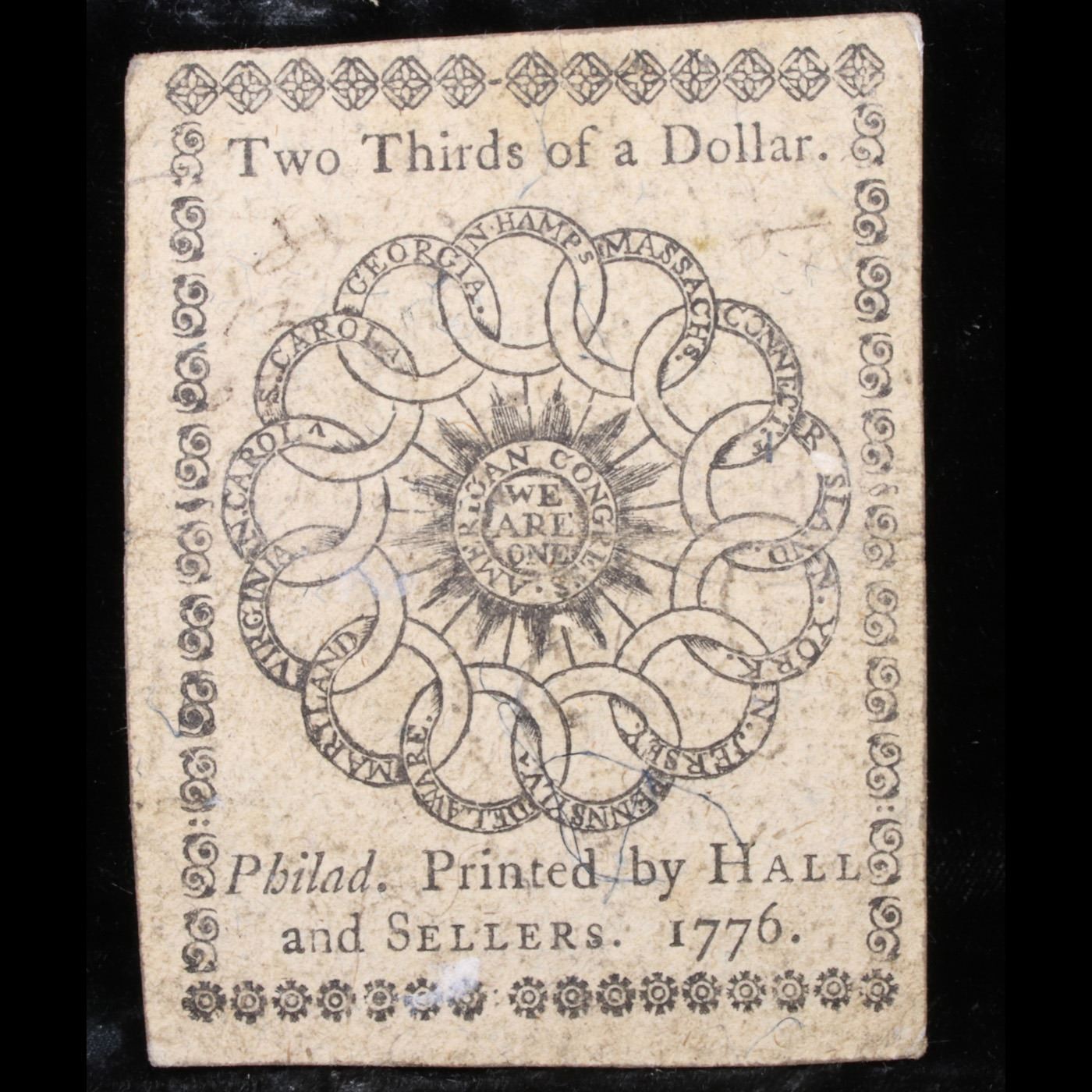 ***Auction Highlight*** Continental Currency February 17, 1776 $2/3 Fr-CC22 Plate C, Grades vf+.        This is the only Continental issue that contained these Fractional denominations. They are extremely popular with collectors, largely due to the use of Ben Franklin's sundial vignette on the face and the thirteen chain links, containing the names of the original colonies, surrounding "We are One" on the back. These devices were adapted for the 1776 Continental Dollar coins and the 1787 Fugio Cent. THis Note is Signed By Benjamin Brannan In Red ink. An emission totaling $4,000,000 payable in Spanish milled dollars, or the equivalent in gold or silver, was authorized by the Continental Congress resolution of February 10, 1776. Of this $1,000,000 was reserved for the first national fractional currency. The front design on the fractional notes includes the first use of the "FUGIO" (I fly) legend and sundial as well as the "Mind your Business" legend. The back shows the thirteen linked rings representing the colonies and the legends "We are one" and "American Congress". Eric Newman has discovered these designs were created by Benjamin Franklin (see his indispensable The Early Paper Money of America p. 53). Note that on the fractional bills the dots in the corners of the front design reflect the denomination, with one dot designating a sixth of a dollar, two dots for a third, three dots for $1/2 and four dots for $2/3. Also, fractional denominations come in plates A, B and C. Again it was Newman who discovered the devices and border designs for the fractional bills were cut by Elisha Gallaudet, who also designed the Continental Currency coin. There is one signer, in red ink, on the fractional bills and two signers, using red and brown ink, on the dollar denominations. Counterfeit detectors for the dollar denominations were made on blue paper. The Franklin designs were adopted for the Continental Currency coin made a few months later and for the 1787 Fugio cents. The paper, made at Ivy Mills in Chester County, Pennsylvania, contained blue fibers and mica flakes. Printed by Hall and Sellers in Philadelphia. Denominations printed were the: $1/6, $1/3, $1/2, $2/3, $1, $2, $3, $4, $5, $6, $7 and $8.