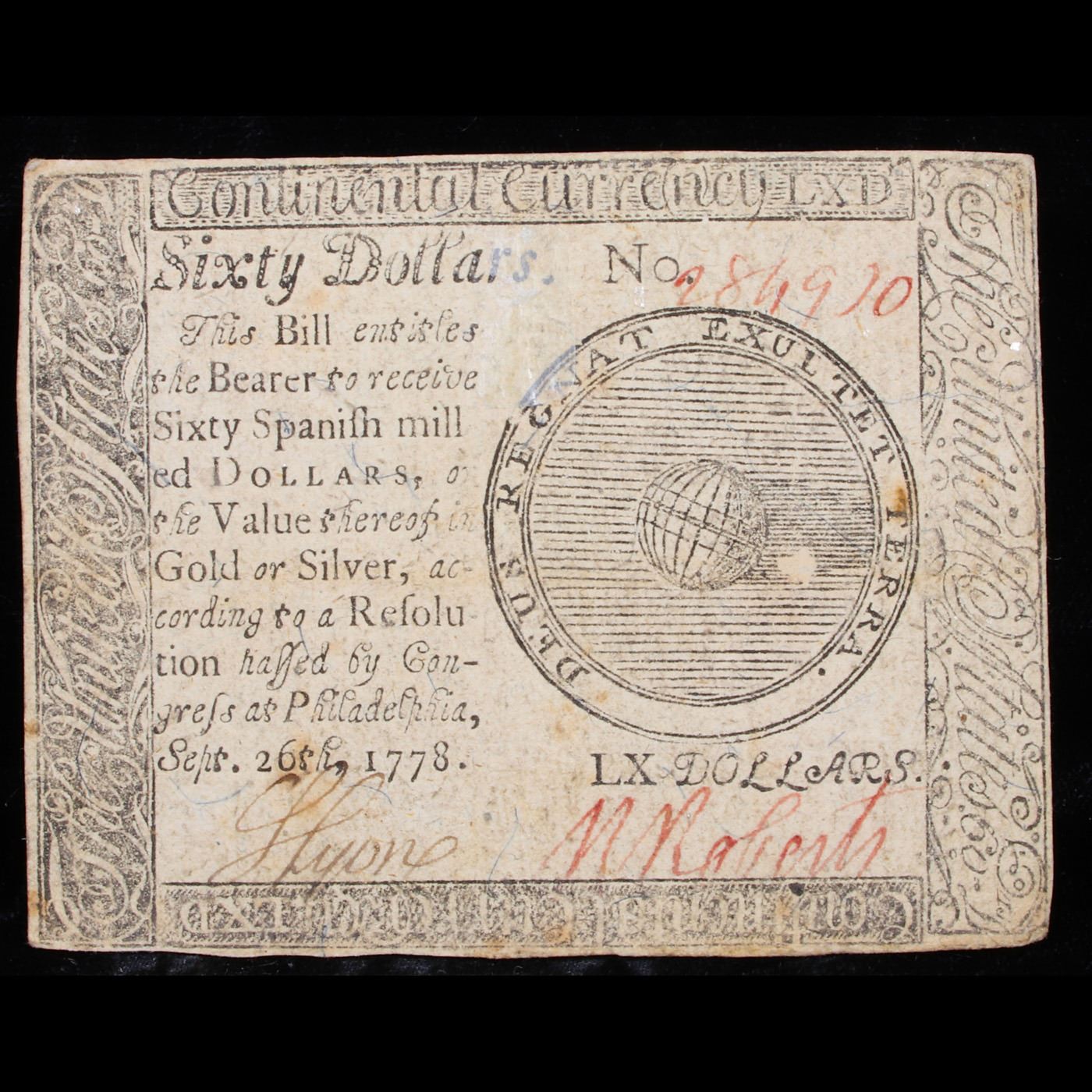 ***Auction Highlight*** Continental Currency Spetember 26th, 1778 $60 Fr-CC86 Sig. L. Lyone & R. Rob