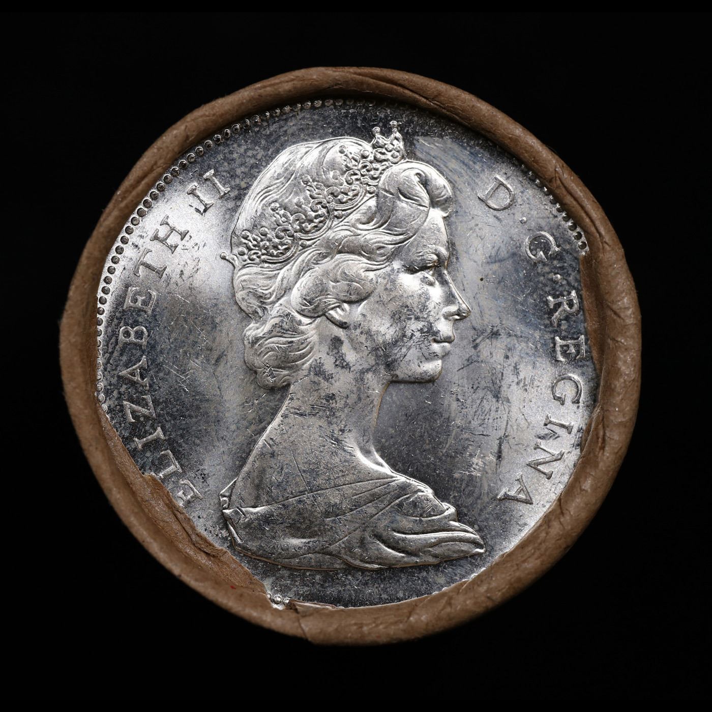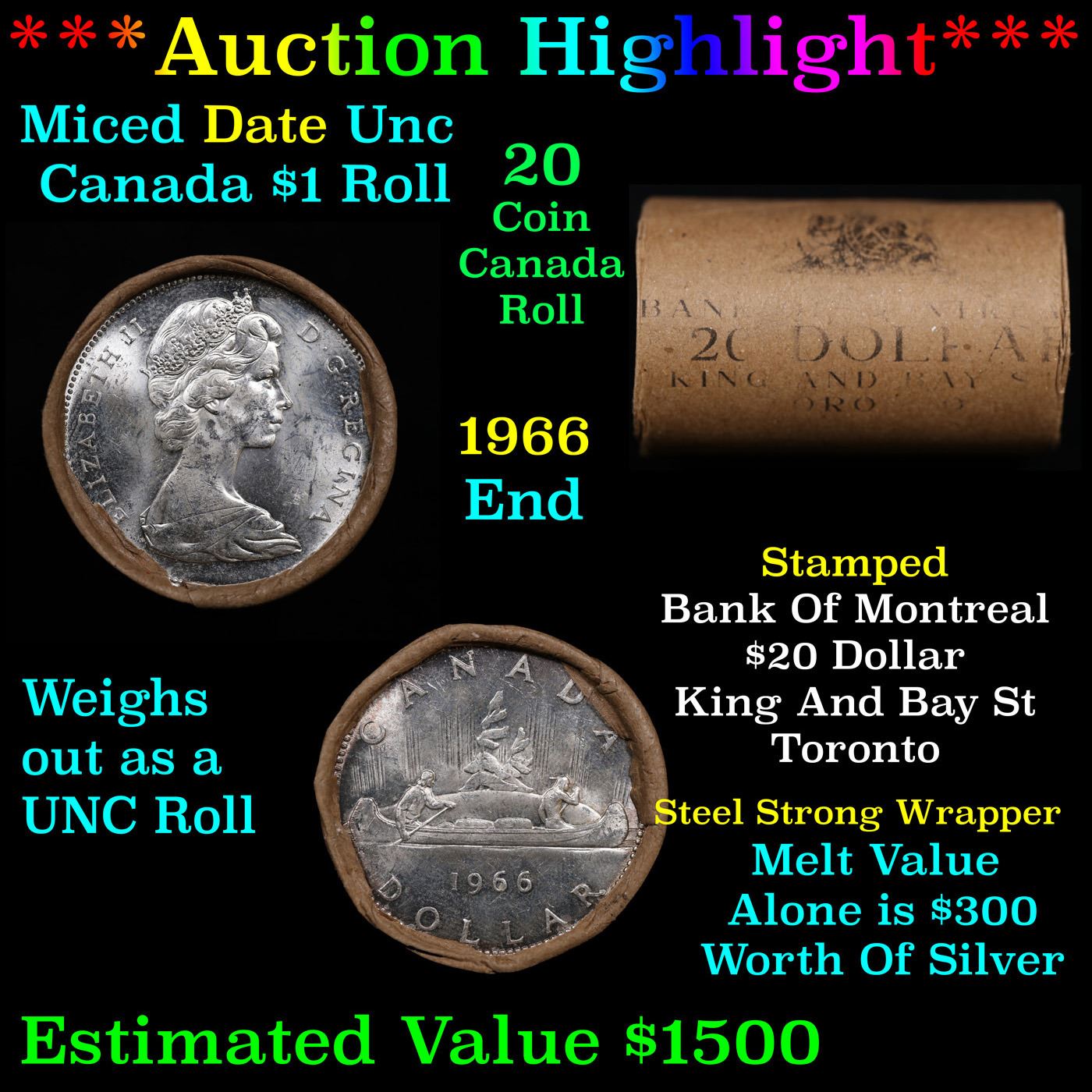 ***Auction Highlight*** Full $20 Bank of Montreal Roll of Silver Mix date with 1965 Ends, Canadian Dollar with Queen Elizabeth II, 20 Coins in total.. This roll is held in an old Bank of Montreal, King and Bay St, Toronto Wrapper with Tight Shotgun Ends, all appear to be GEM or higher. Had not been check for types.