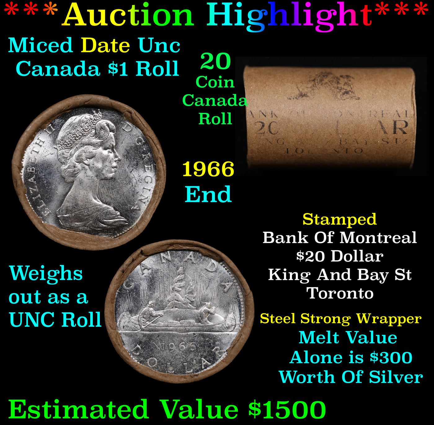***Auction Highlight*** Full $20 Bank of Montreal Roll of Silver Mix date with 1966 Ends, Canadian Dollar with Queen Elizabeth II, 20 Coins in total.. This roll is held in an old Bank of Montreal, King and Bay St, Toronto Wrapper with Tight Shotgun Ends, all appear to be GEM or higher. Had not been check for types.